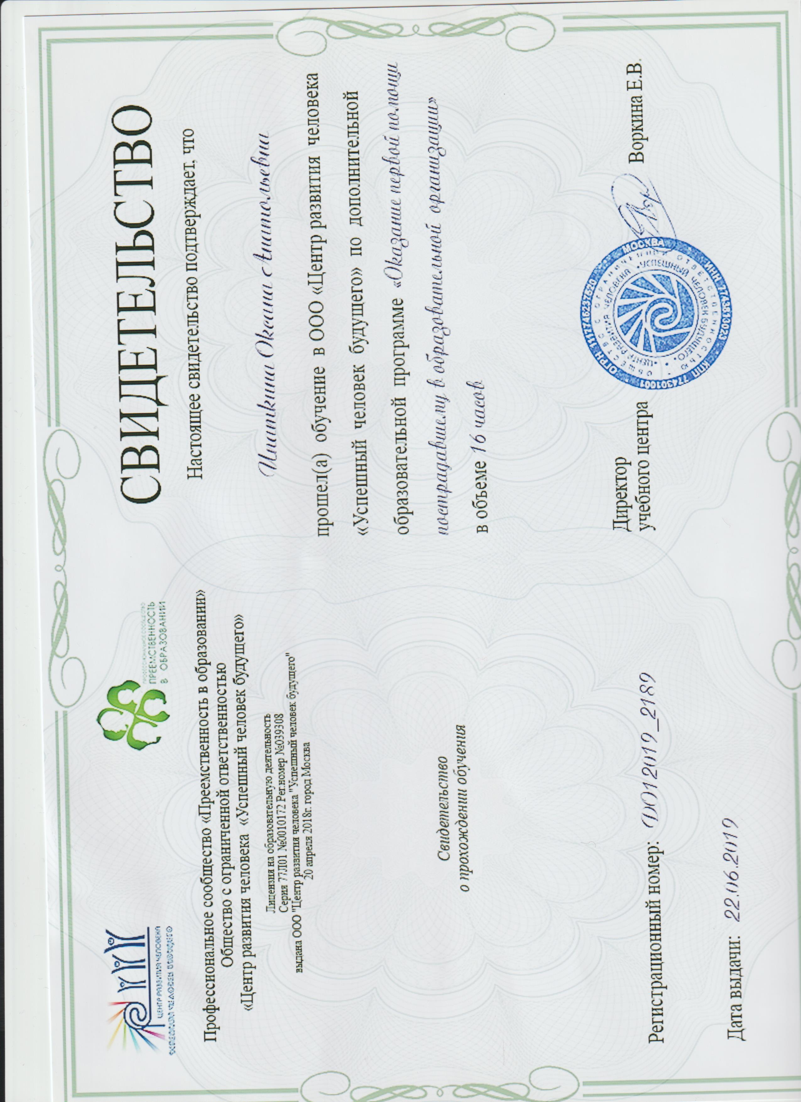 Обучение по курсу: "Оказание первой медицинской помощипострадавшему в ДО". Документ о повышении квалификации: скачать