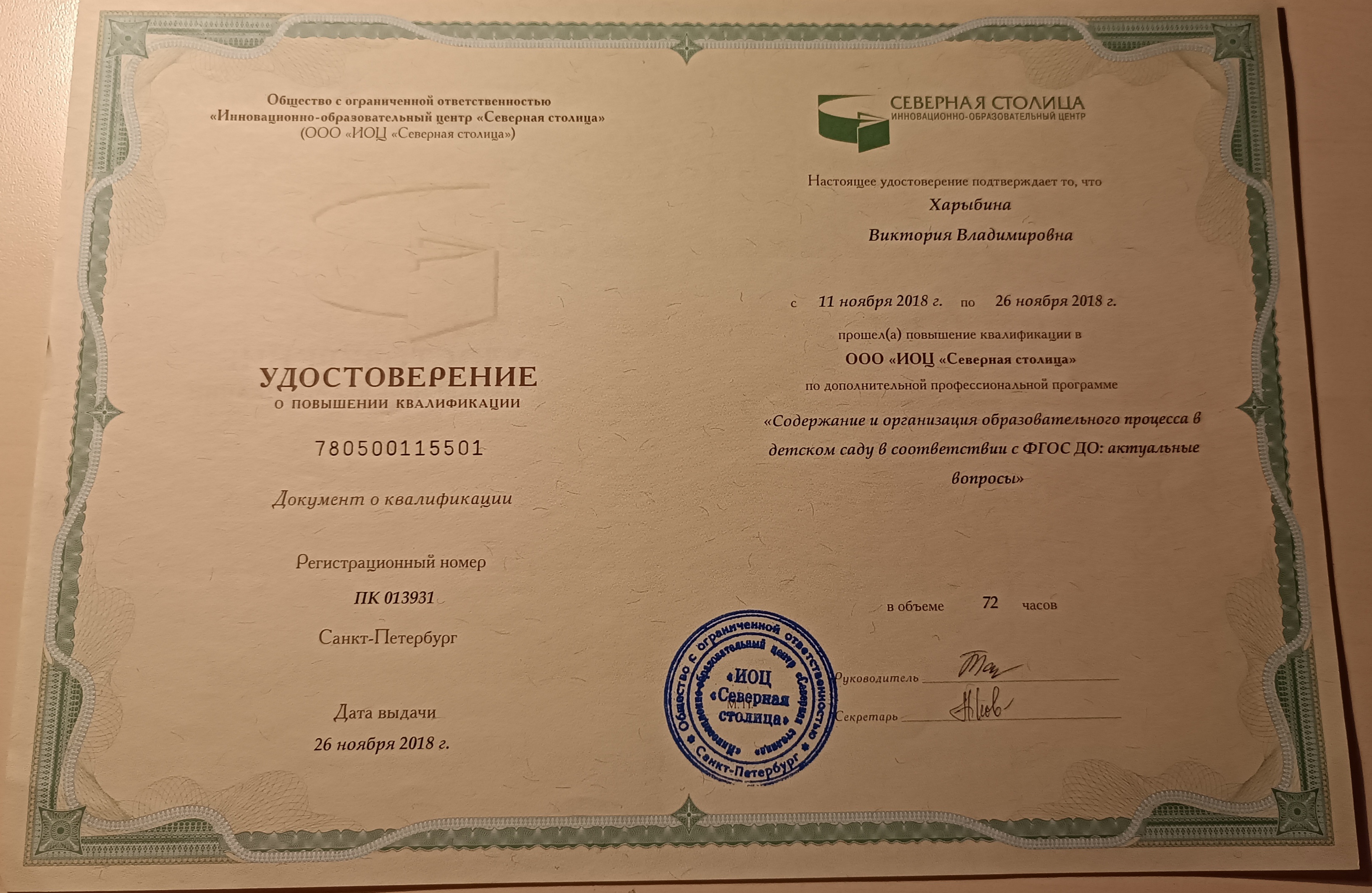 Обучение по курсу: " Содержание и организация образовательного процесса в детском саду в соответствии с ФГОС ДО: актуальные вопросы". Документ о повышении квалификации: скачать