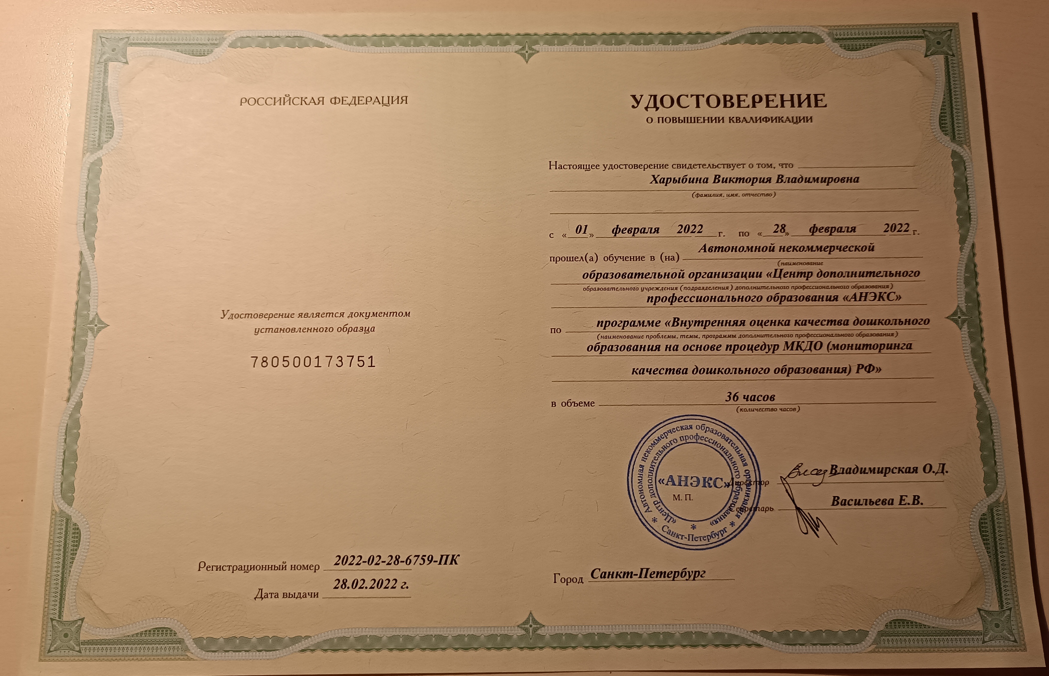 Обучение по курсу: "Внутренняя оценка качества дошкольного образования на основе процедур МКДО(мониторинга качества дошкольного образования) РФ" . Документ о повышении квалификации: скачать