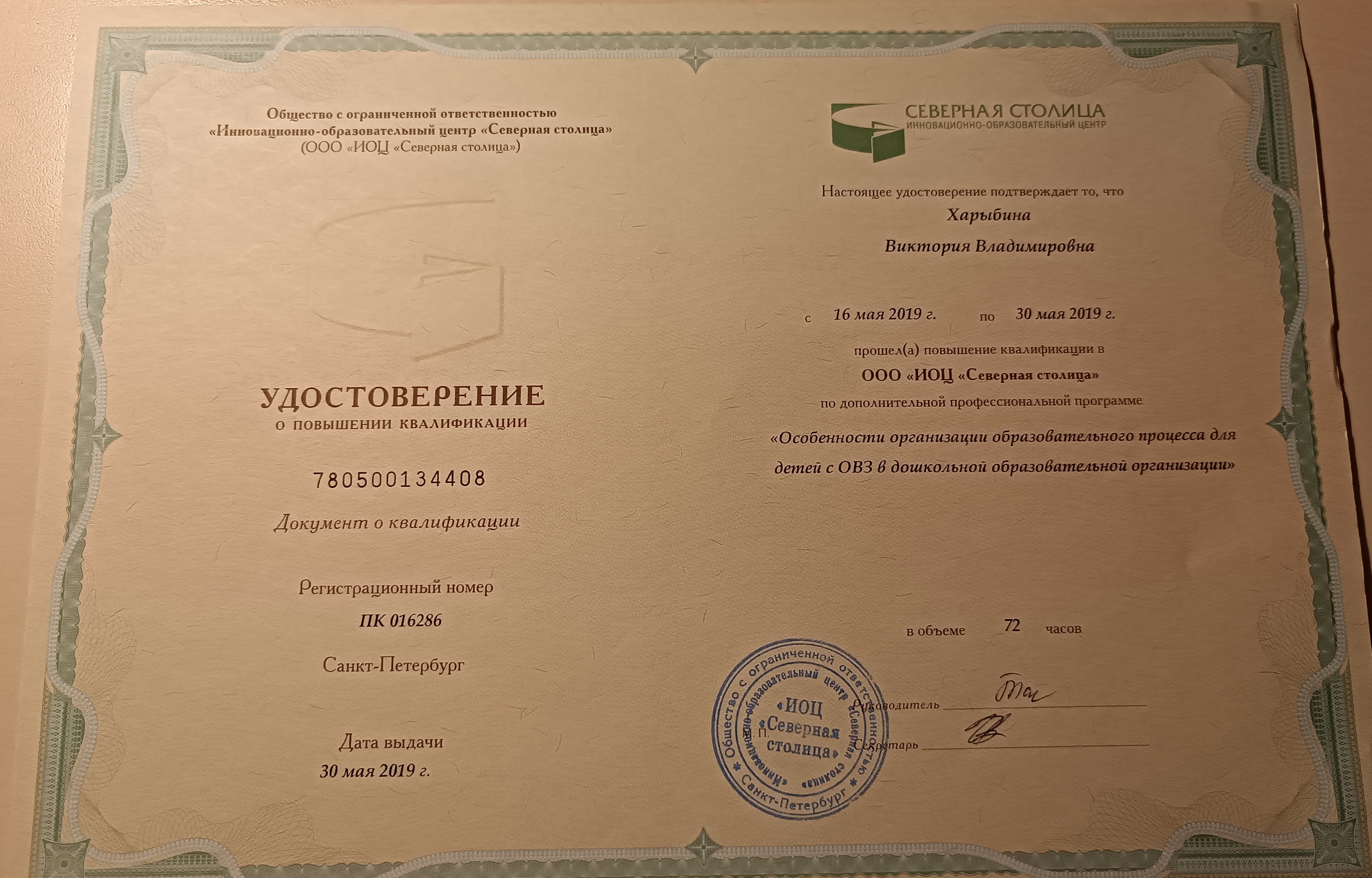 Обучение по курсу: " Особенности организации образовательного процесса для детей с ОВЗ в дошкольной образовательной организации.". Документ о повышении квалификации: скачать