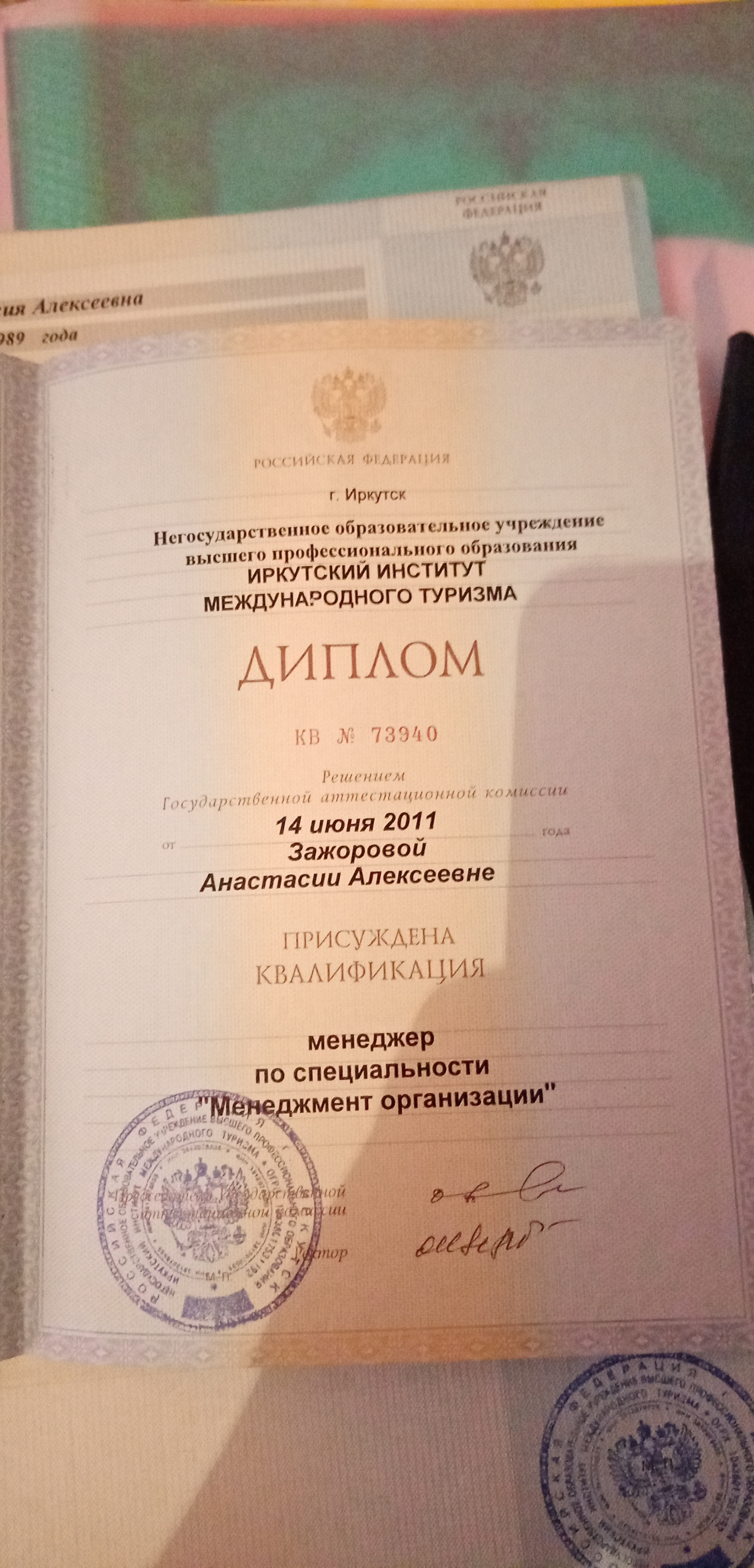 Образование по специальности: Менеджмент организации . Присвоена квалификация: Менеджер . Документ о получении образования: скачать