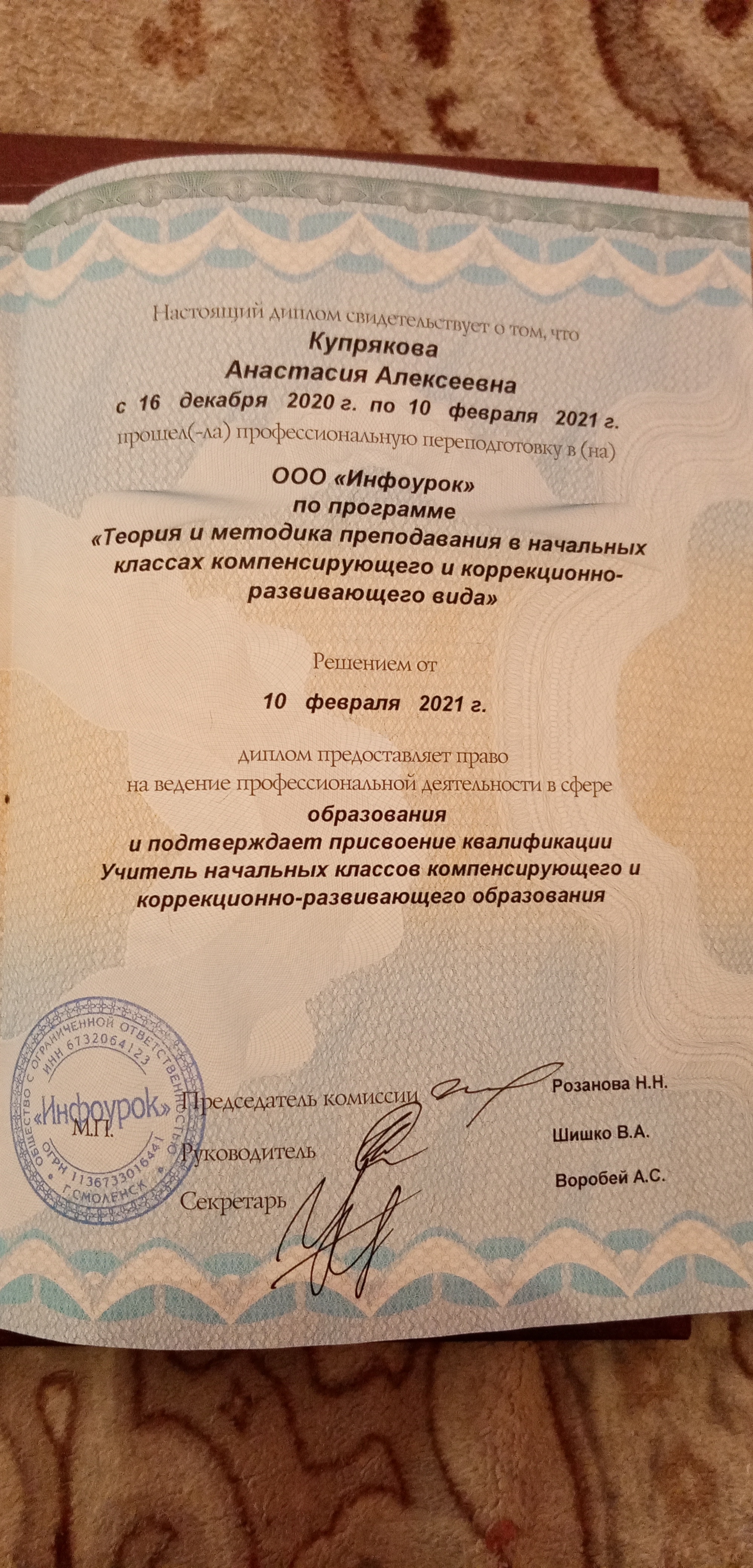 Образование по специальности: Учитель . Присвоена квалификация: Учитель начальных классов компенсиркющего и коррекционно- развивающего образования. Документ о получении образования: скачать