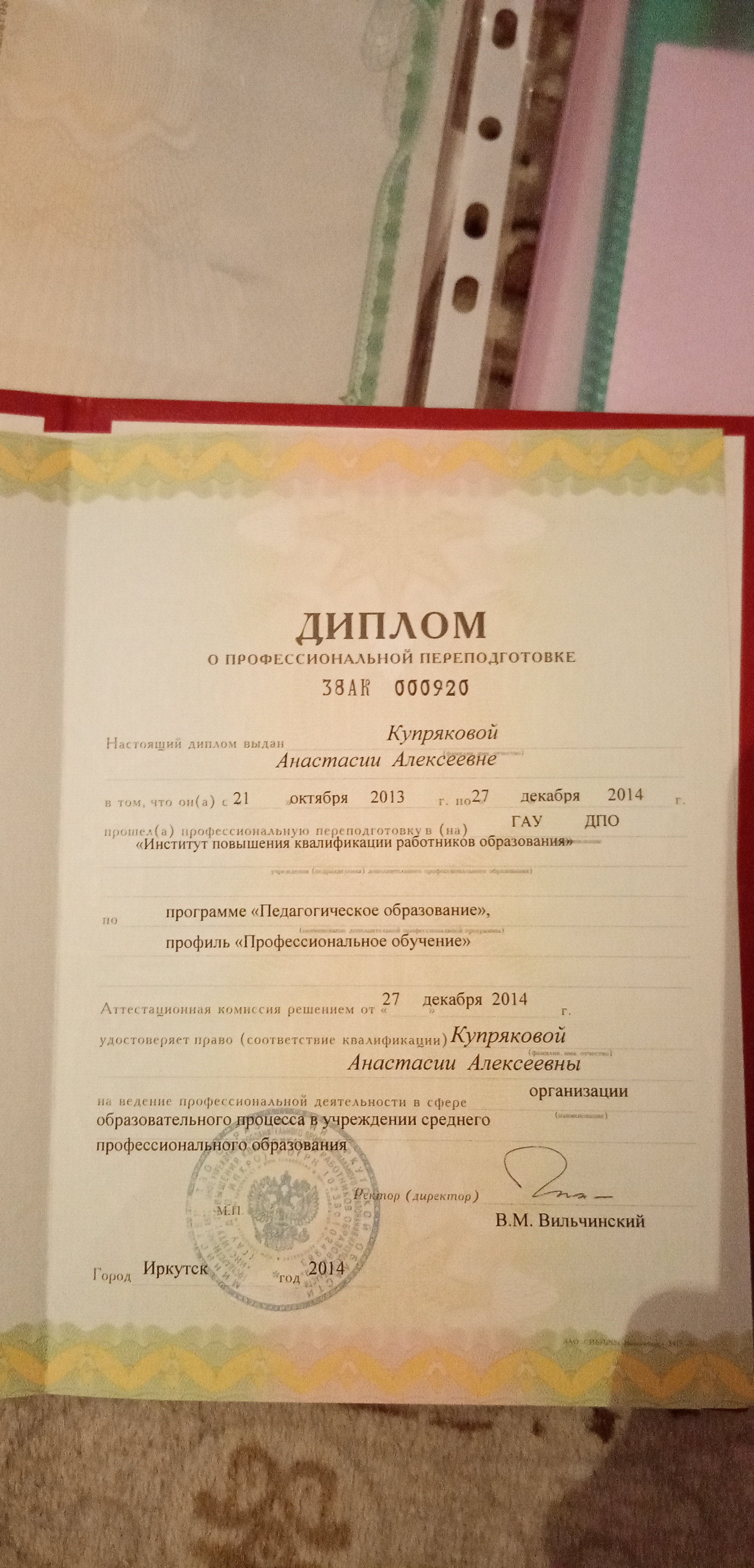 Образование по специальности: Педагогическое образование . Присвоена квалификация: Профессиональное обучение. Документ о получении образования: скачать