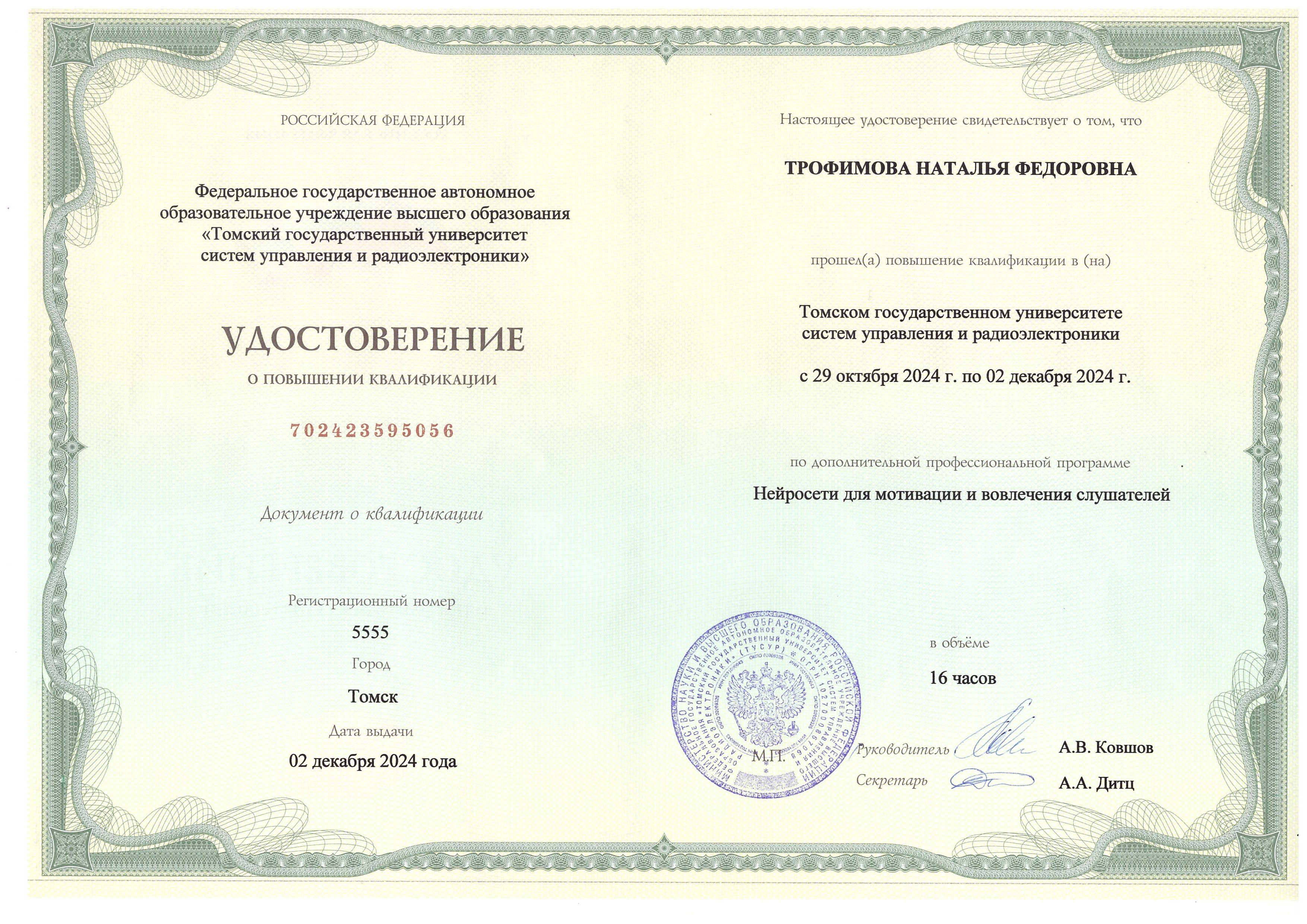 Обучение по курсу: Нейросети для мотивации и вовлечения слушателей. Документ о повышении квалификации: скачать