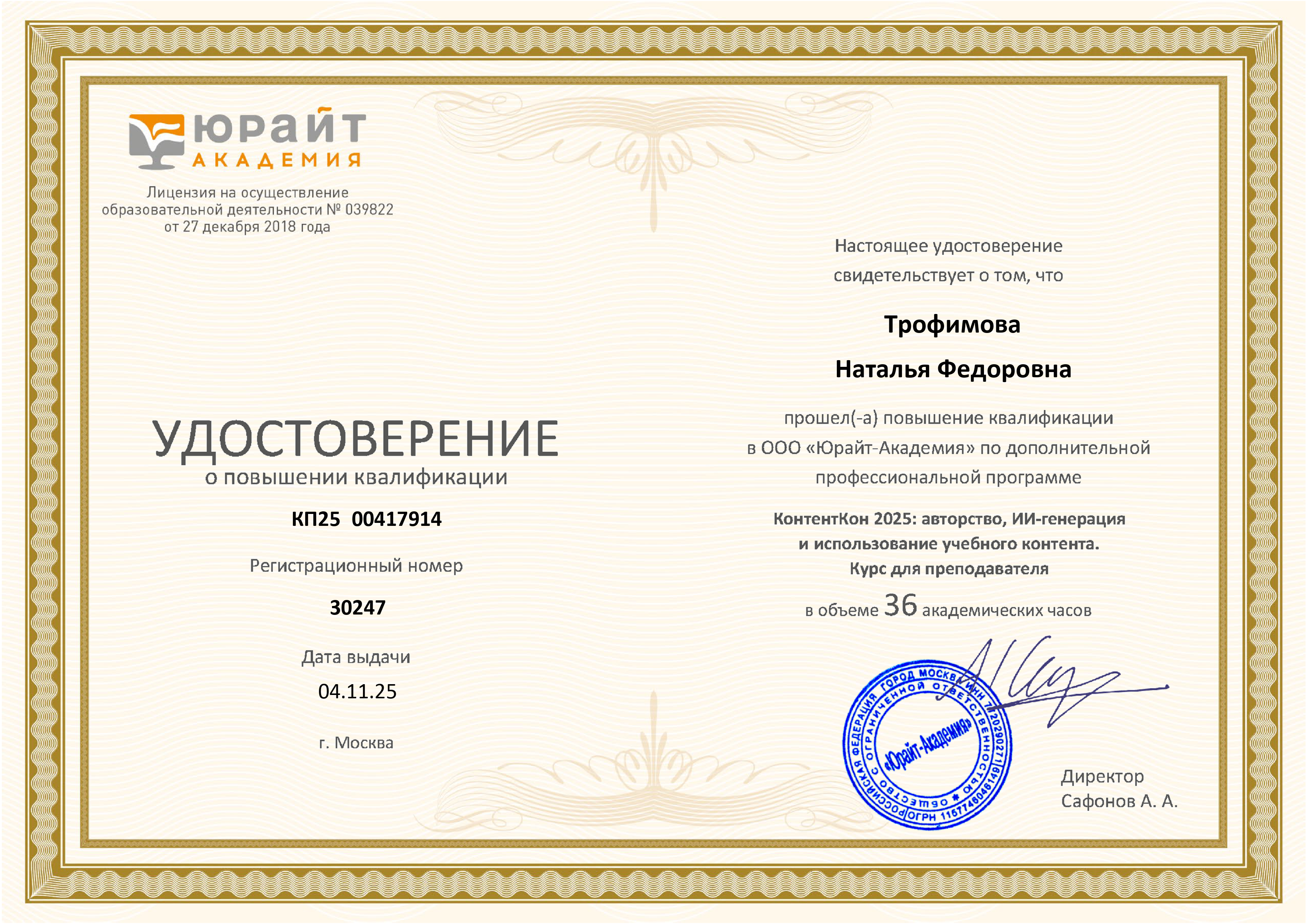 Обучение по курсу: КонтентКон 2025: авторство, ИИ –генерация и использование учебного контента. Курс для преподавателей (дистанционная). Документ о повышении квалификации: скачать