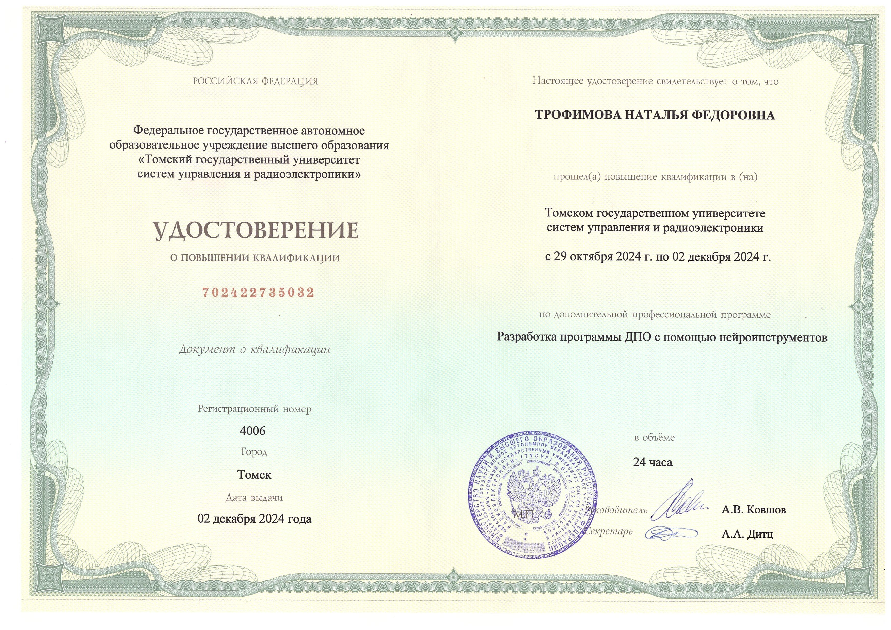 Обучение по курсу: Разработка программы ДПО с помощью нейроинструментов. Документ о повышении квалификации: скачать
