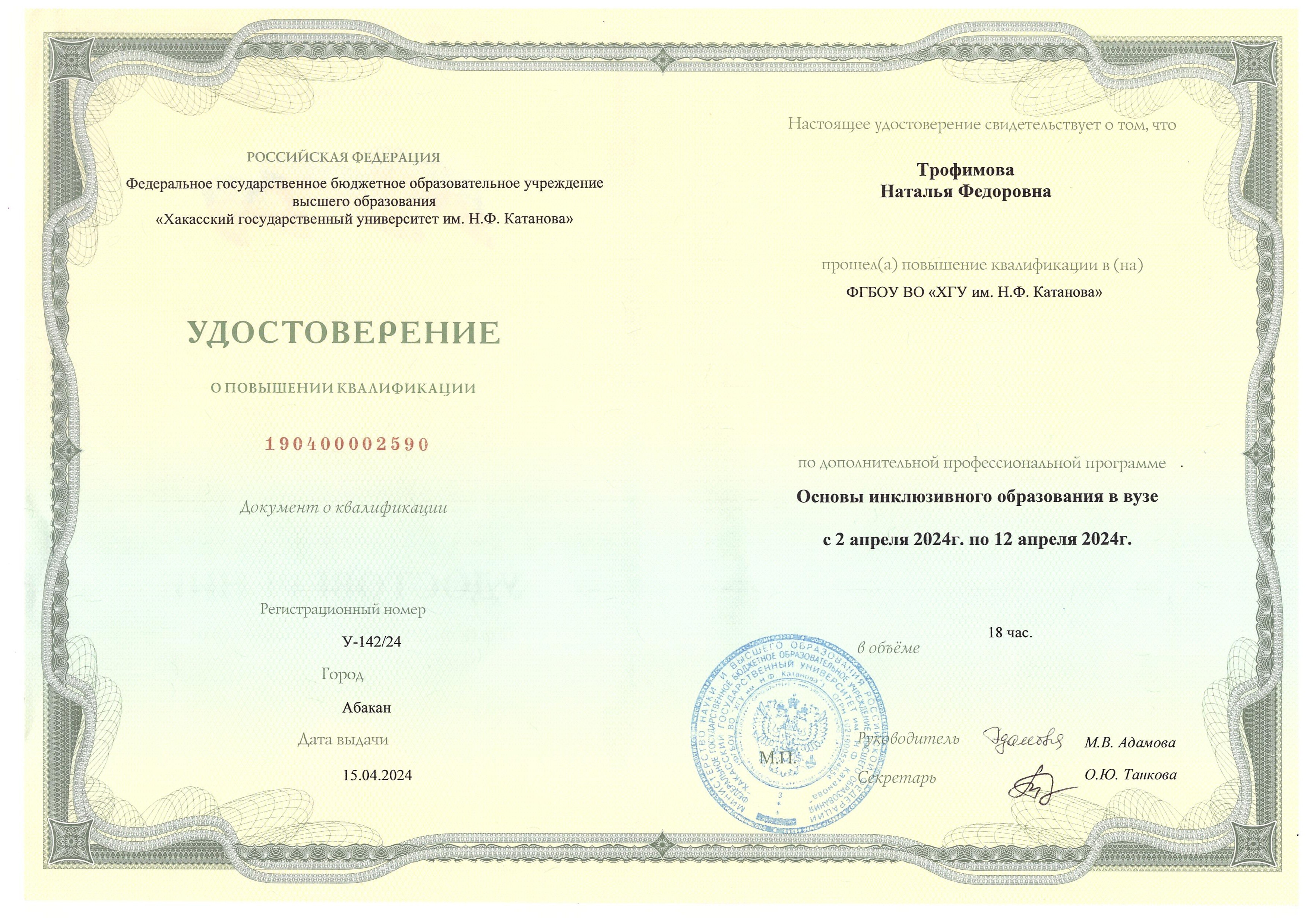 Образование по специальности: Математика. Присвоена квалификация: учитель математики и информатики. Документ о получении образования: скачать
