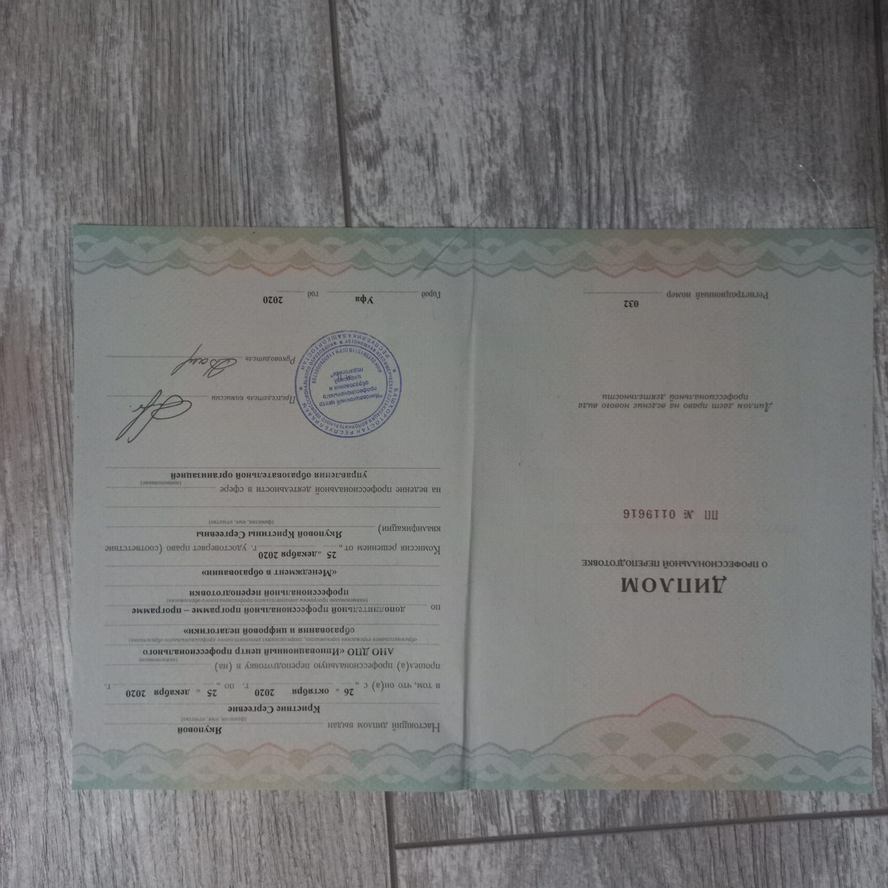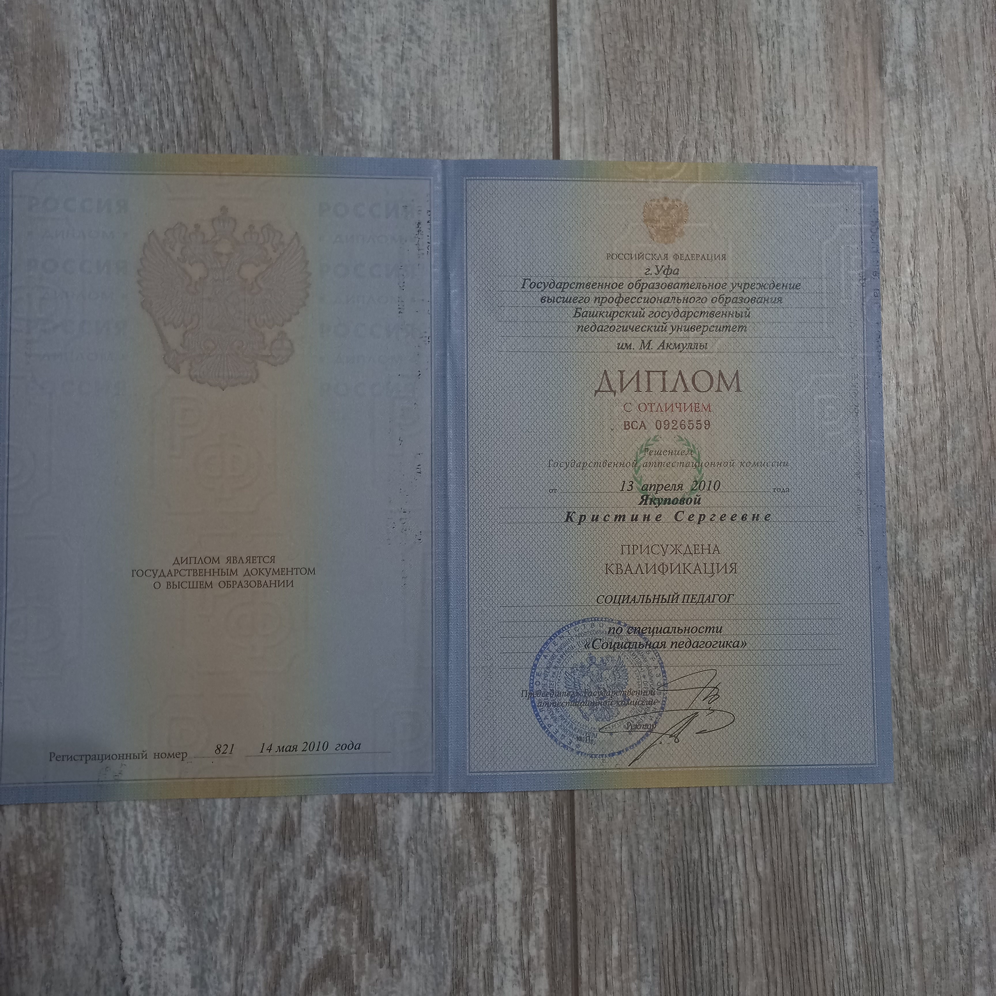 Образование по специальности: социальная педагогика. Присвоена квалификация: социальный педагог. Документ о получении образования: скачать