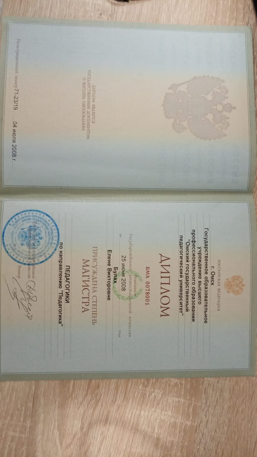 Образование по специальности: магистр. Присвоена квалификация: магистр педагогики по направлению "Педагогика". Документ о получении образования: скачать