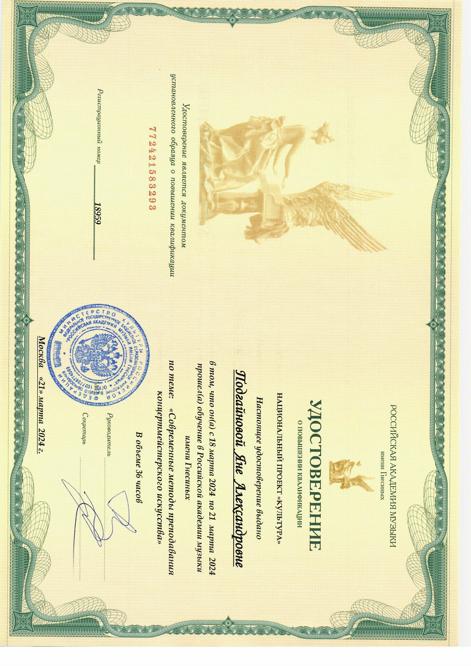 Образование по специальности: 53.02.03 инструментальное исполнительство ( по видам инструментов) . Присвоена квалификация: Артист, преподаватель, концертмейстер. Документ о получении образования: скачать