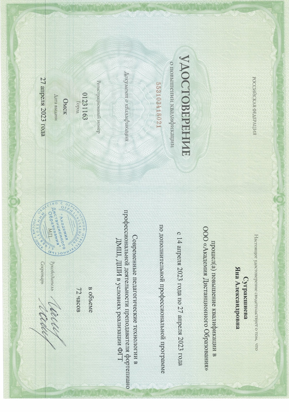 Обучение по курсу: Современные педагогические технологии профессиональной деятельности преподавателя фортепиано ДМШ, ДШИ в условиях реализации ФГТ. Документ о повышении квалификации: скачать