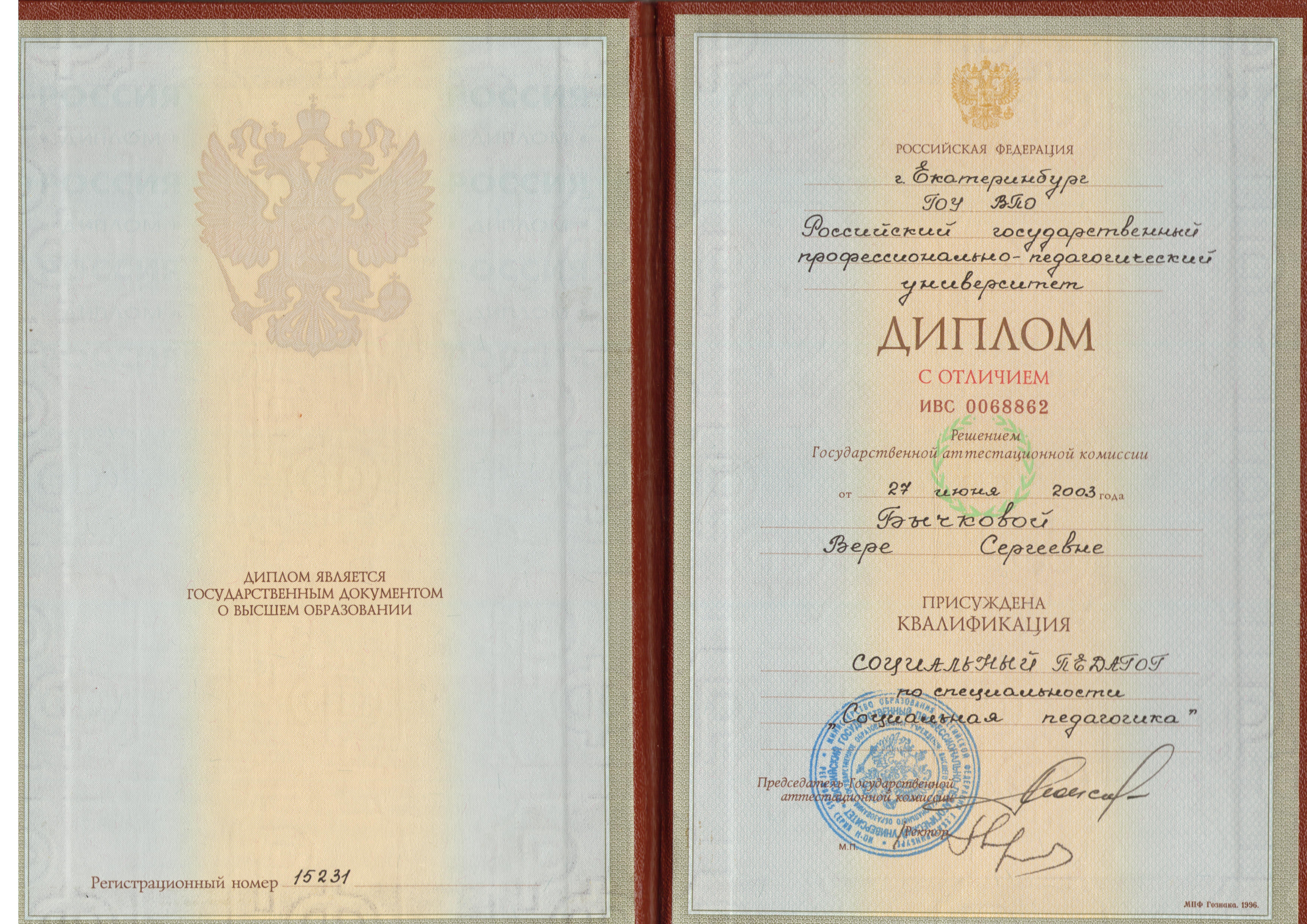 Образование по специальности: социальная педагогика. Присвоена квалификация: социальный педагог. Документ о получении образования: скачать