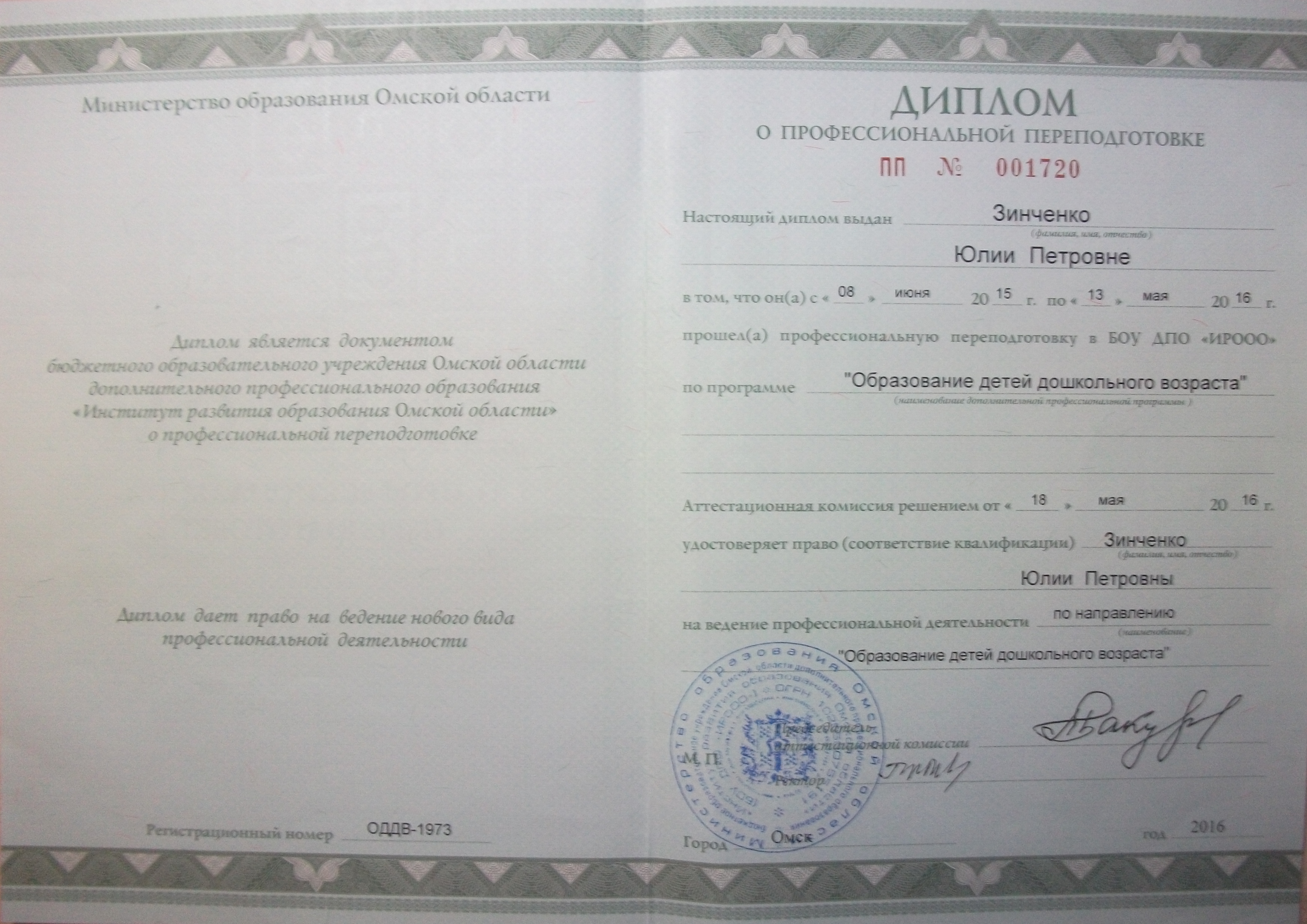 Образование по специальности: Педагогика и психология. Присвоена квалификация: педагог - психолог. Документ о получении образования: скачать