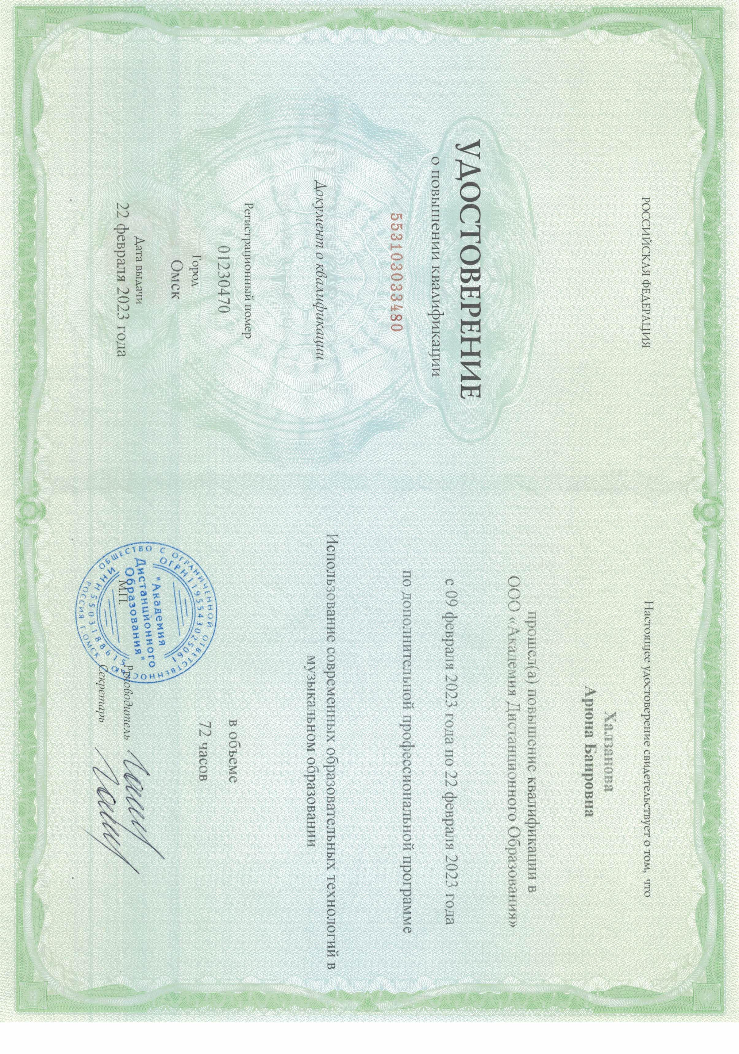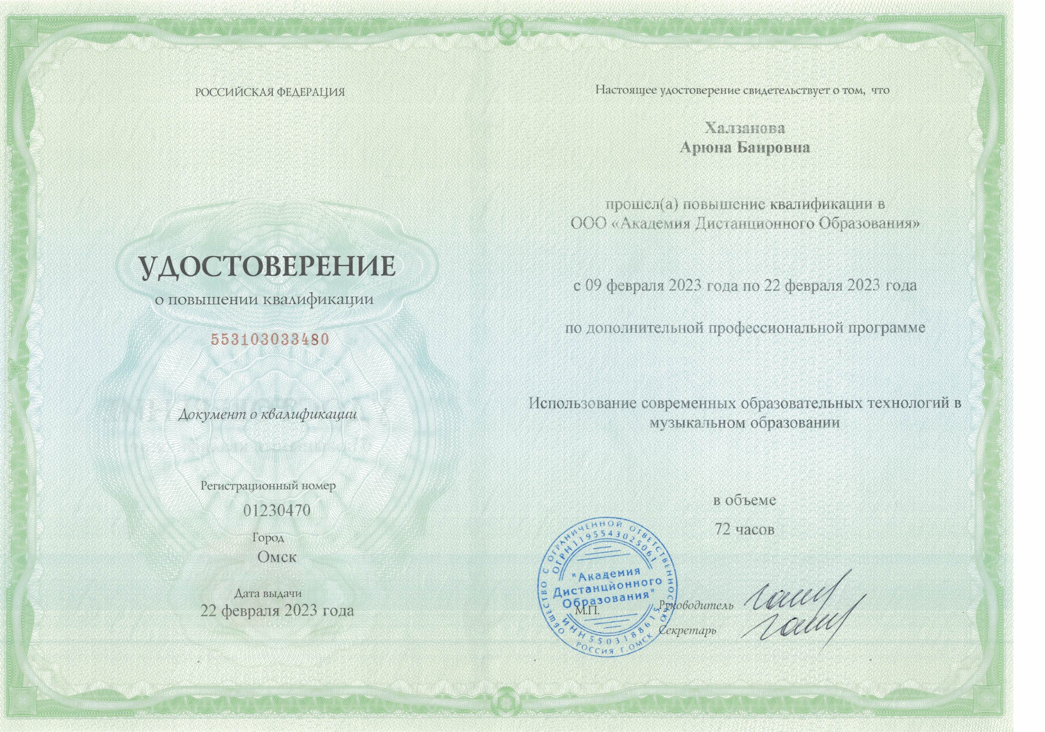 Обучение по курсу: Использование современных образовательных технологий в музыкальном обрвзовании . Документ о повышении квалификации: скачать
