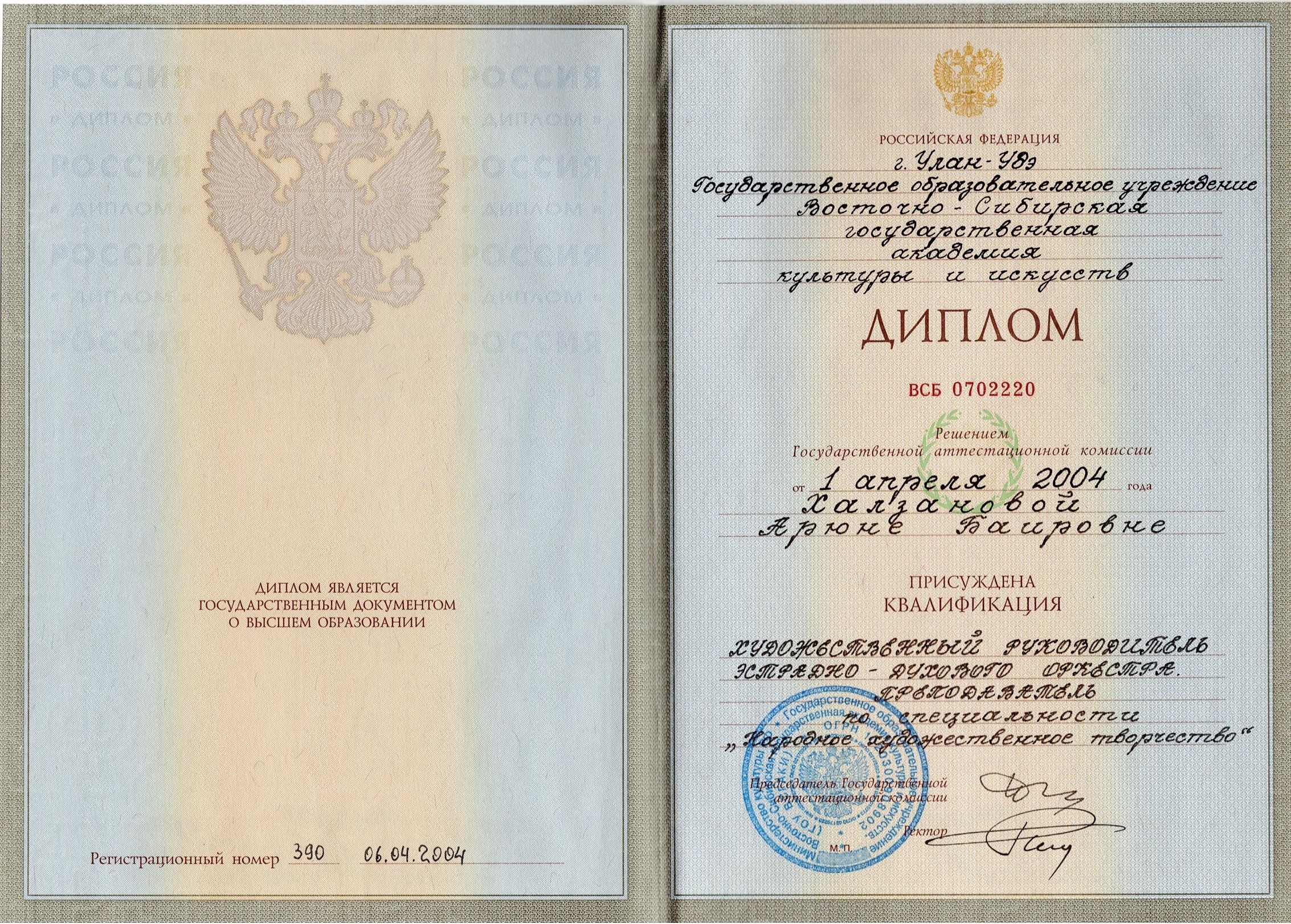 Образование по специальности: Народное художественное творчество.. Присвоена квалификация: Художественный руководитель эстрадно-духового оркестра, преподаватель.. Документ о получении образования: скачать