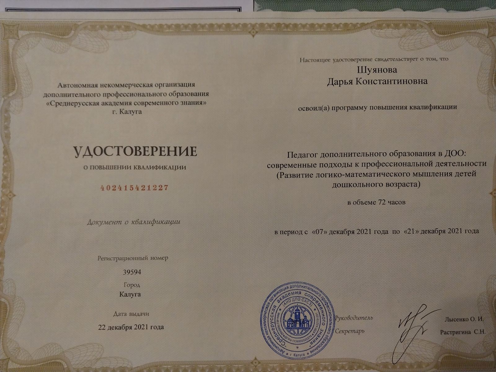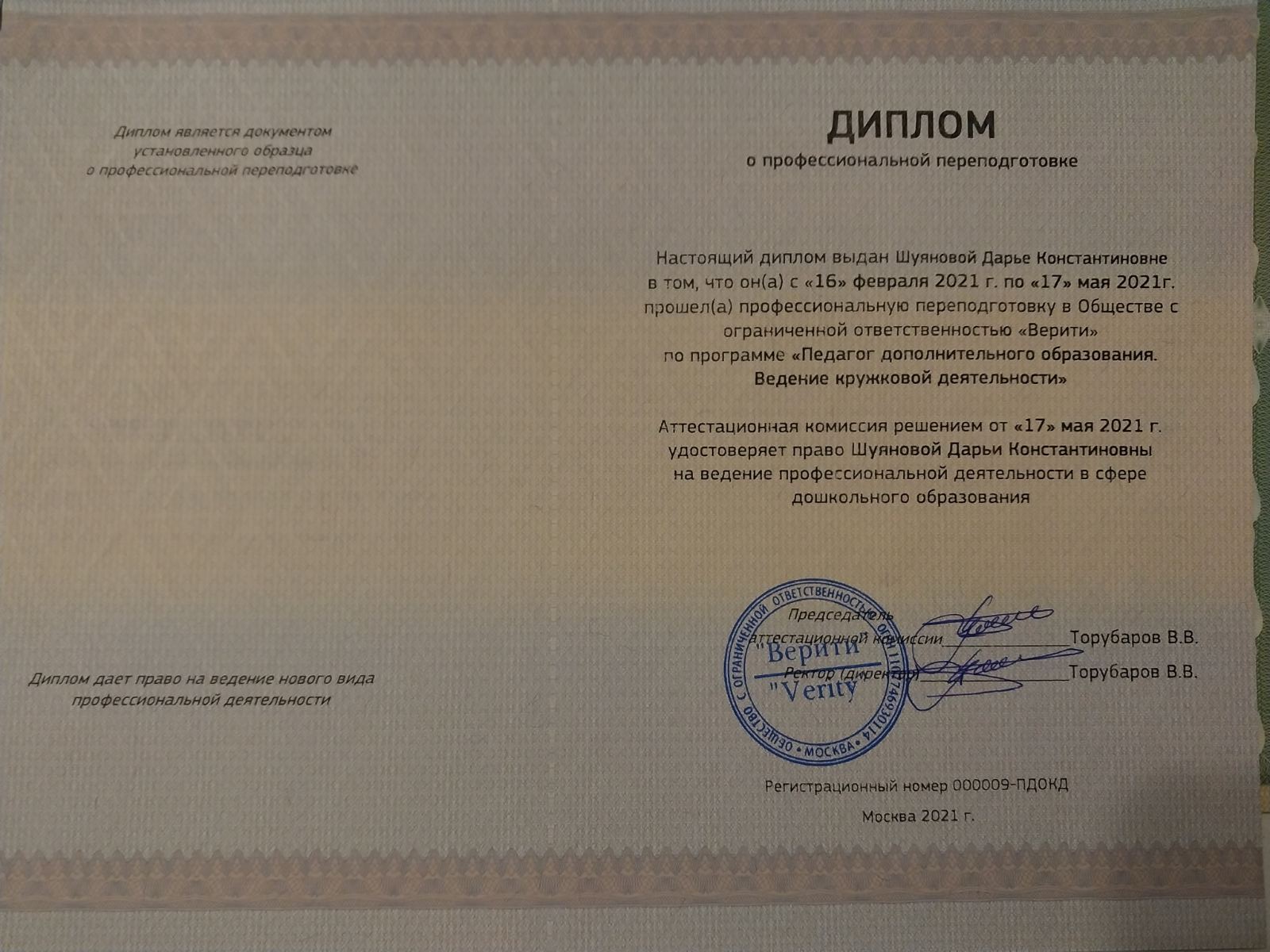 Образование по специальности: Педагог дополнительного образования. Ведение кружковой деятельности". Присвоена квалификация: Педагог дополнительного образования. Ведение кружковой деятельности". Документ о получении образования: скачать