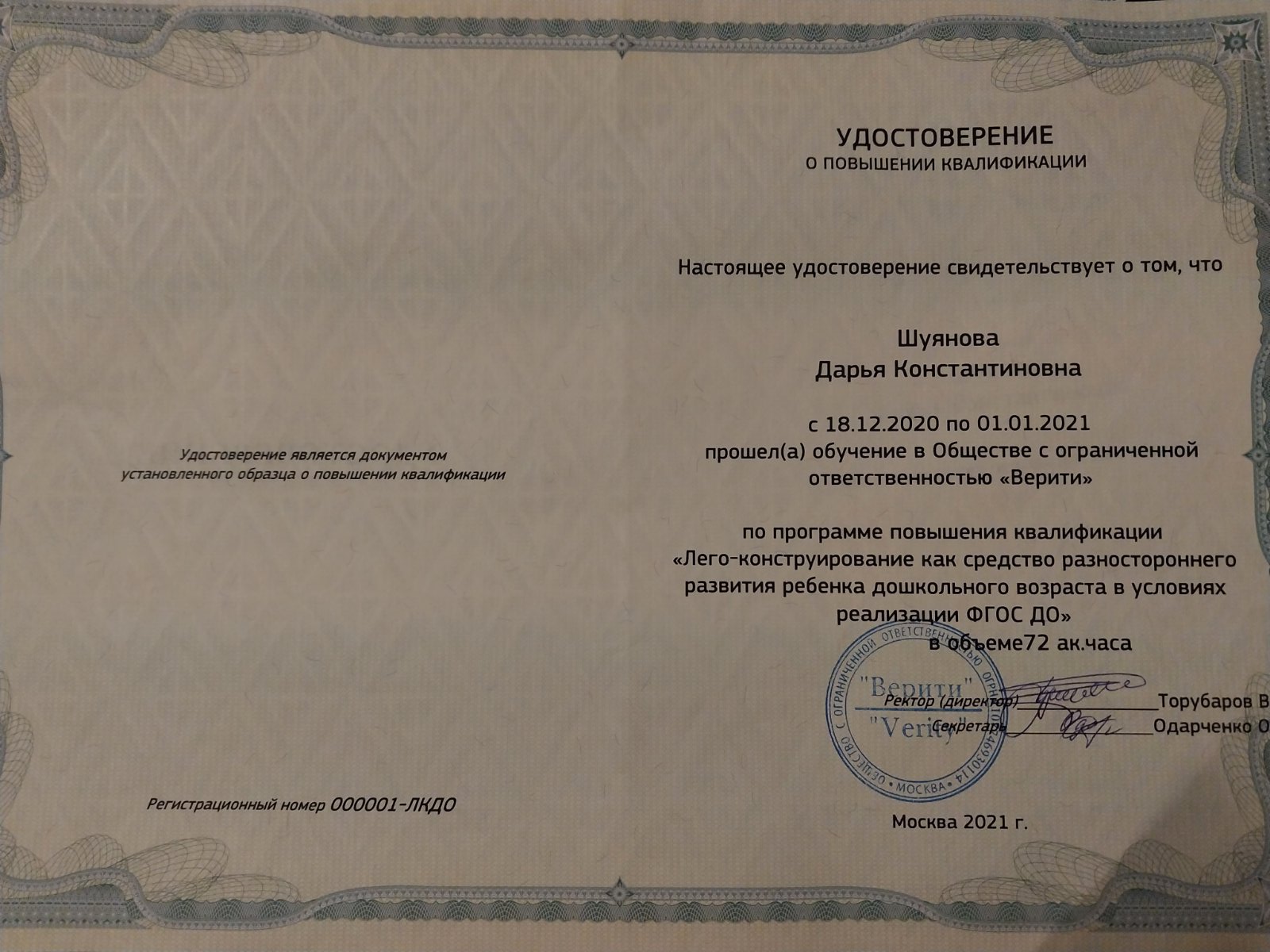 Обучение по курсу: "Лего-конструирование как средство разностороннего развития ребенка дошкольного возраста в условиях реализации ФГОС ДО". Документ о повышении квалификации: скачать