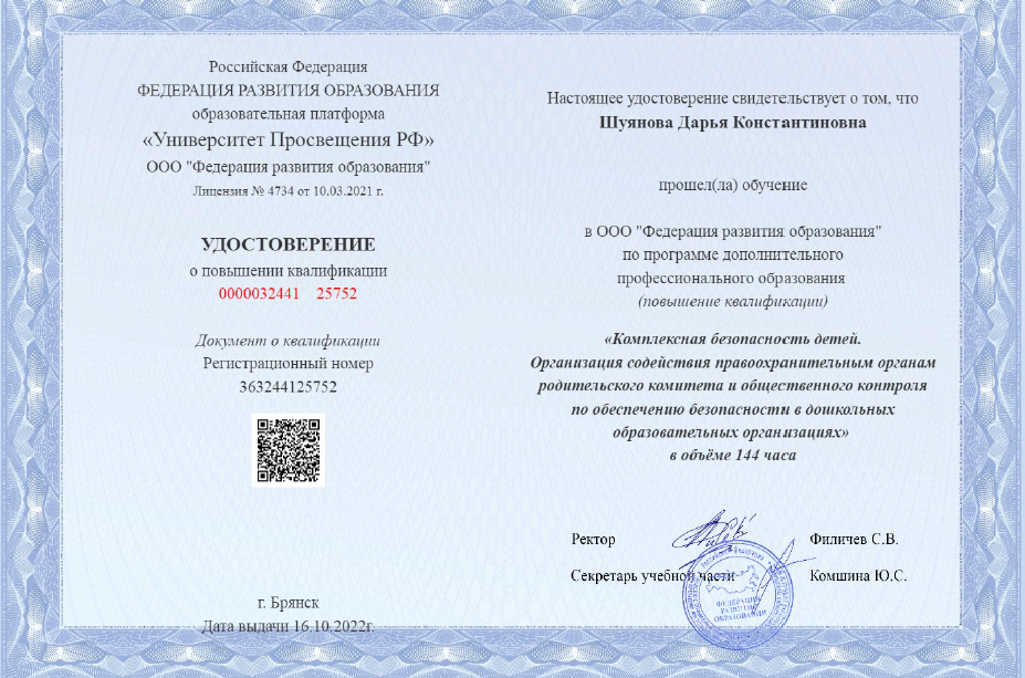 Обучение по курсу: "Комплексная безопасность детей. Организация содействия правоохранительным органам родительского комитета и общественного контроля по обеспечению безопасности в дошкольных образовательных организациях".. Документ о повышении квалификации: скачать