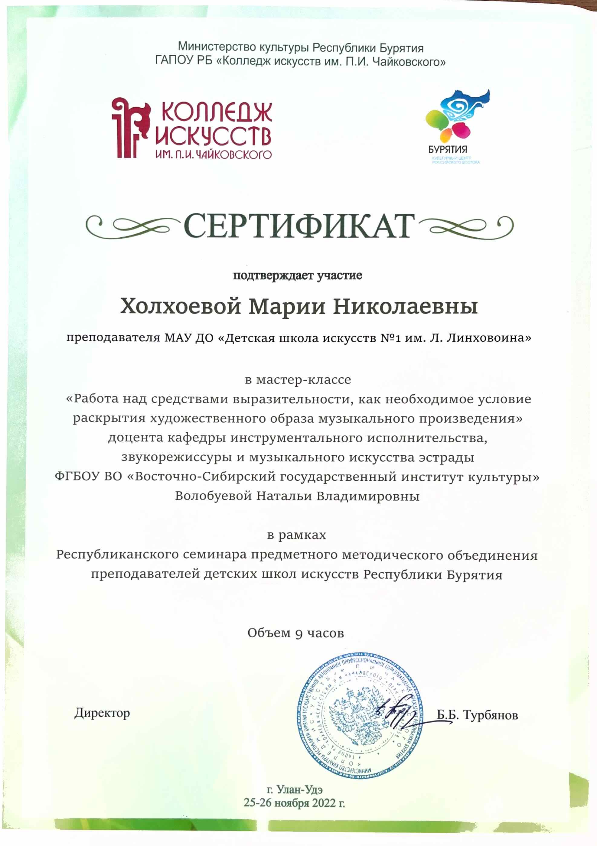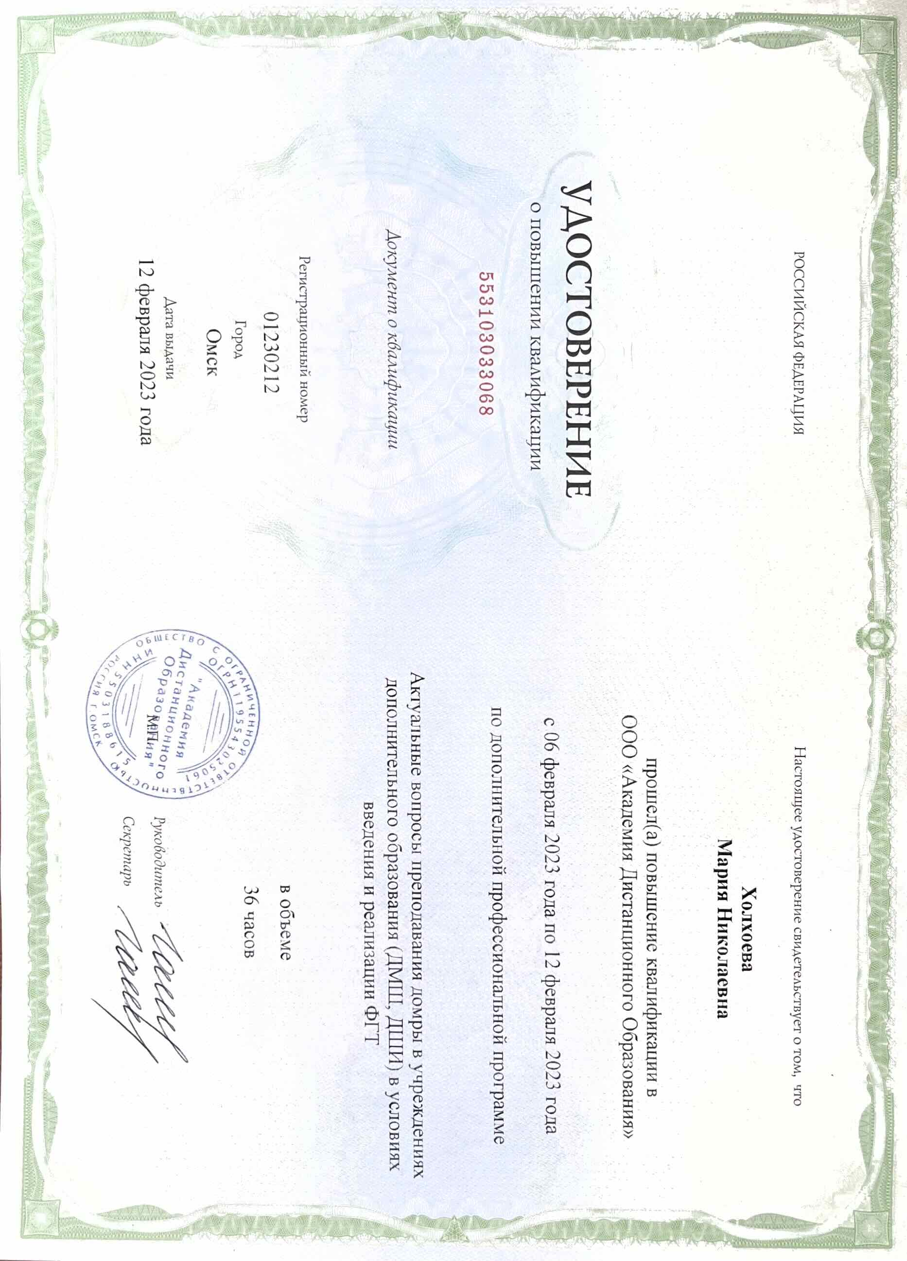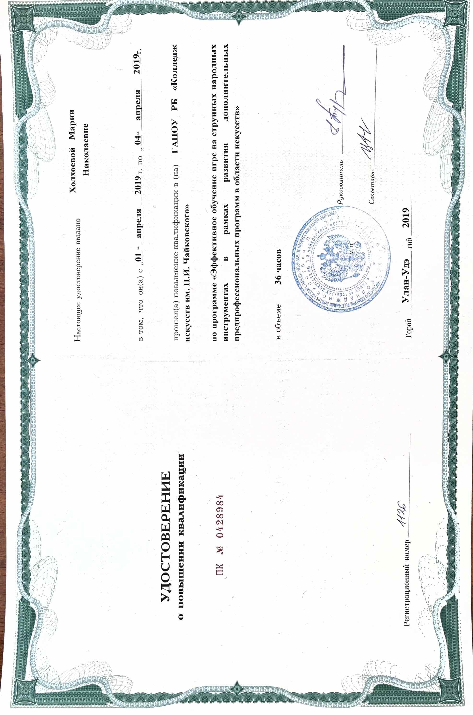 Обучение по курсу: Эффективное обучение игре на струнных народных инструментах в рамках развития дополнительных предпрофессиональных программ в области искусств . Документ о повышении квалификации: скачать