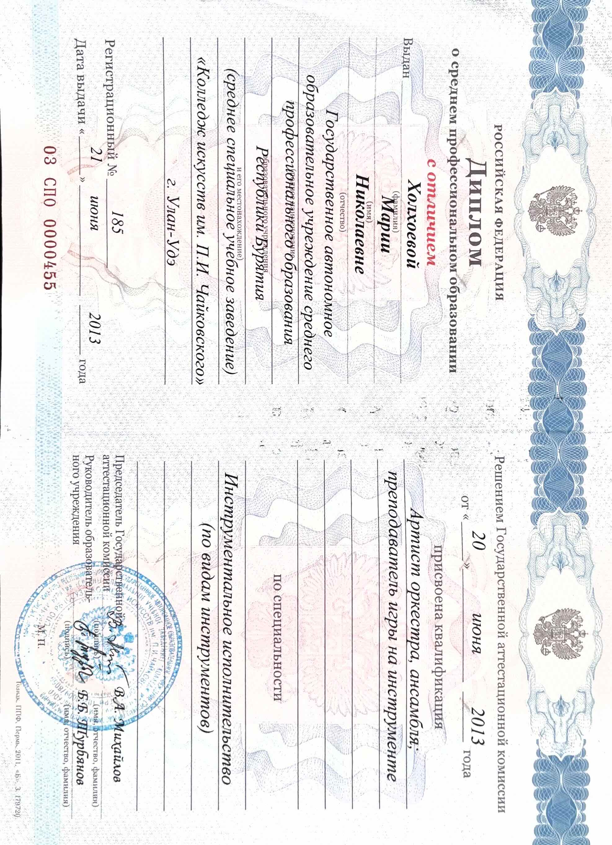 Образование по специальности: Инструментальное исполнительство . . Присвоена квалификация: Артист оркестра, ансамбля, преподаватель игры на инструменте. Документ о получении образования: скачать
