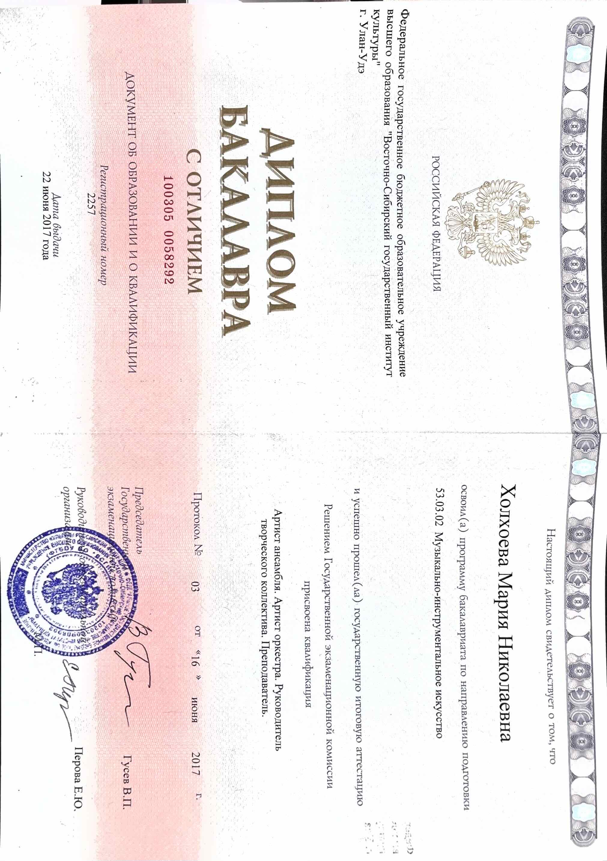 Образование по специальности: Музыкально-инструментальное искусство. . Присвоена квалификация: Артист оркестра. Артист ансамбля . Руководитель творческого коллектива. Преподаватель. . Документ о получении образования: скачать