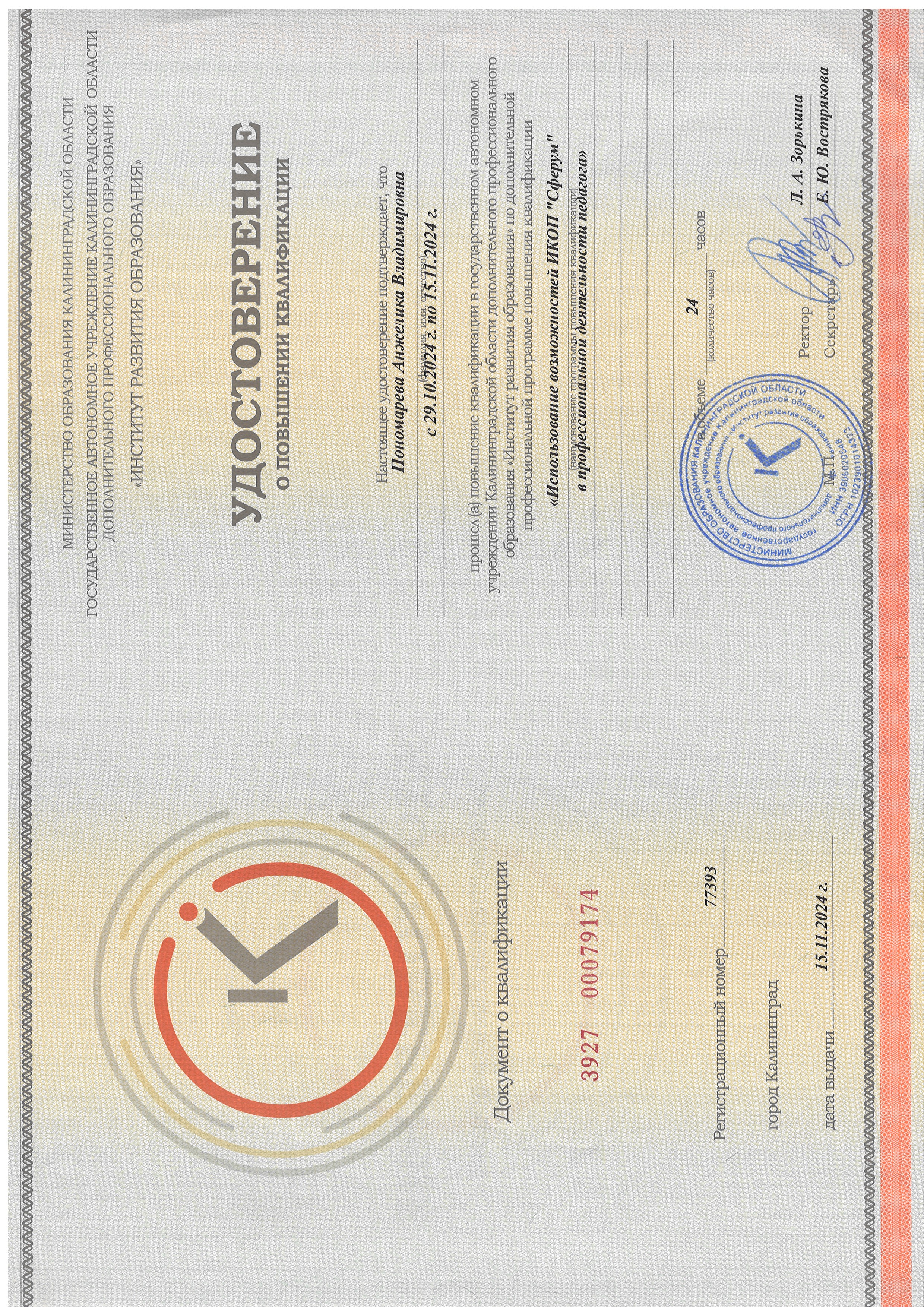 Обучение по курсу: Обучение по курсу "Использование возможностей ИКОП "Сферум" в профессиональной деятельности педагога". Документ о повышении квалификации: скачать