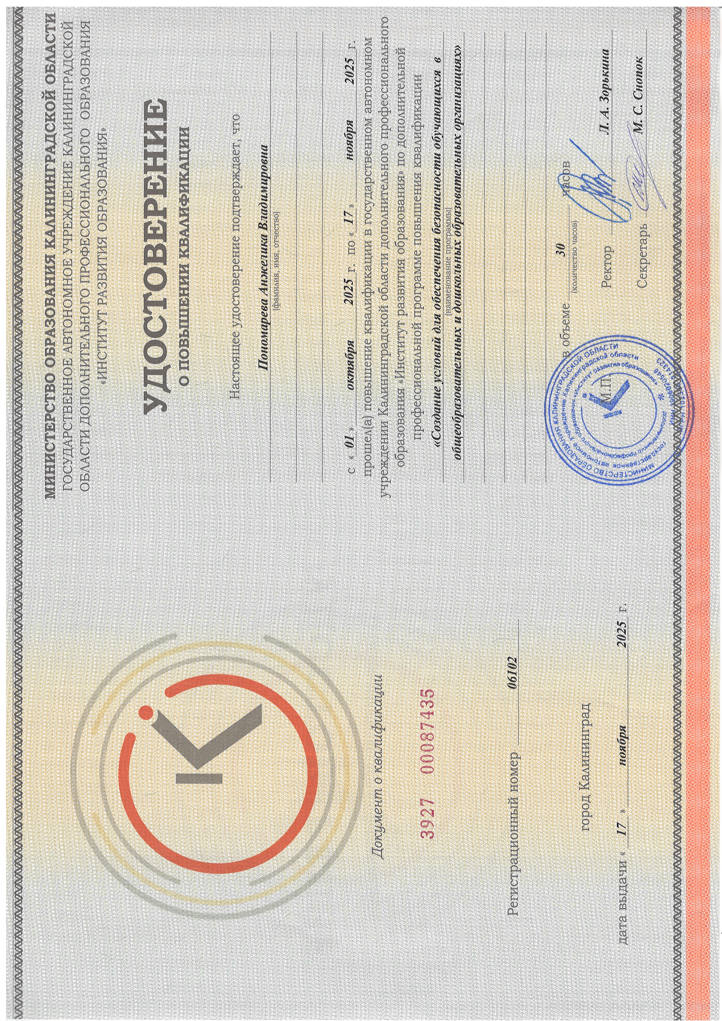 Обучение по курсу: Обучение по курсу "Создание условий для обеспечения безопасности обучающихся в общеобразовательных и дошкольных образовательных организациях". Документ о повышении квалификации: скачать