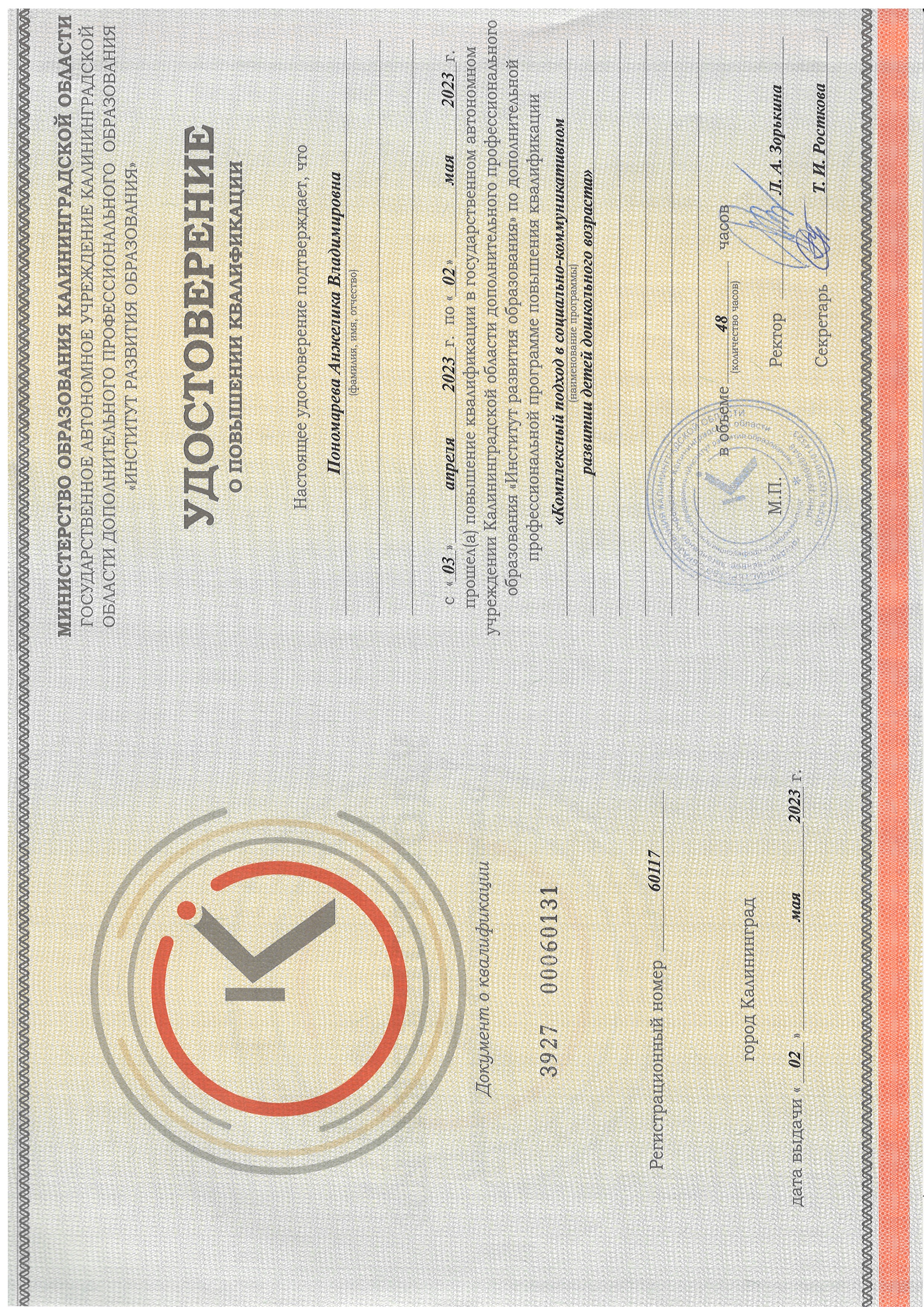 Обучение по курсу: Обучение по курсу "Комплексный подход в социально-коммуникативном развитии детей дошкольного возраста". Документ о повышении квалификации: скачать