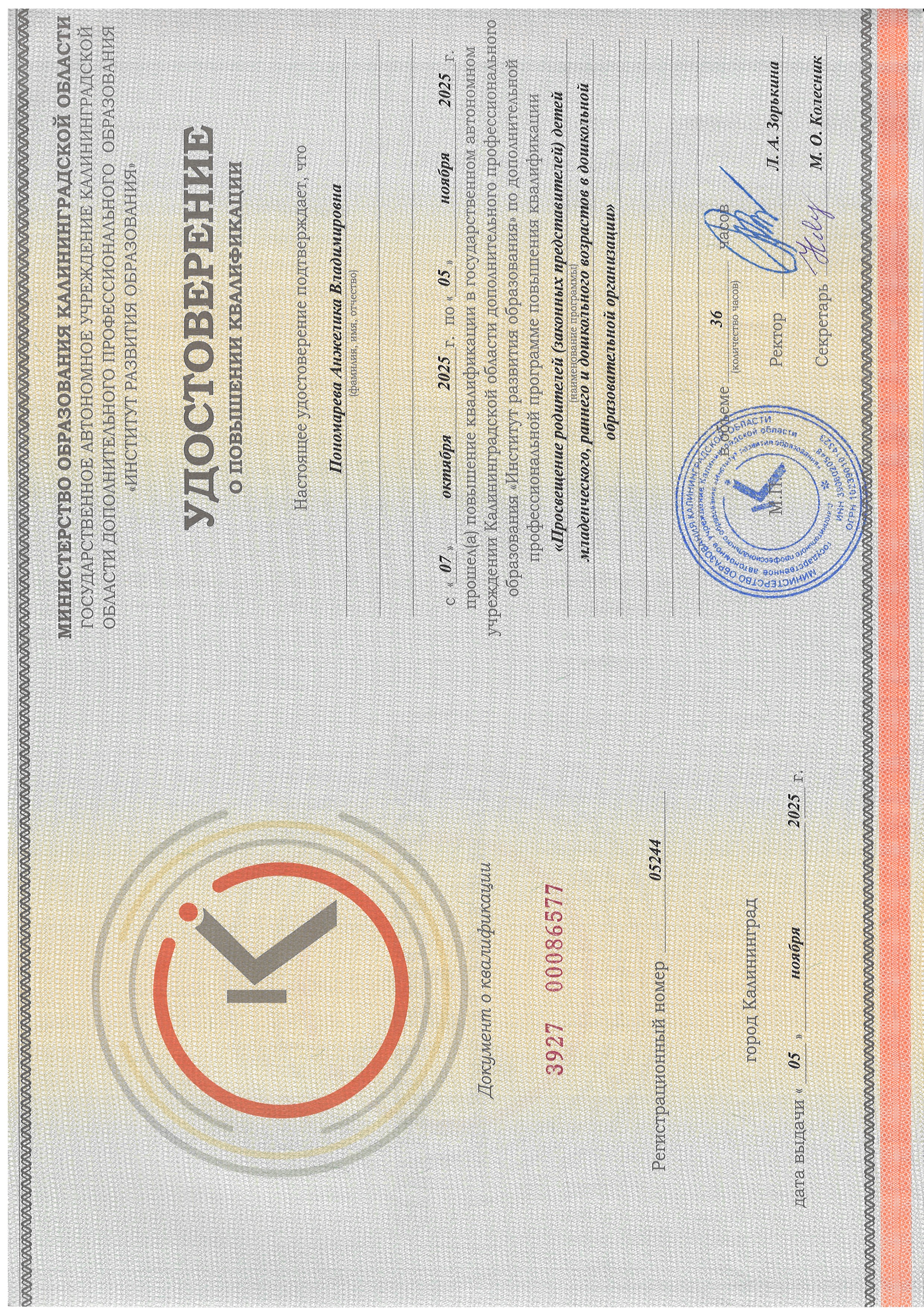 Обучение по курсу: Обучение по курсу "Просвещение родителей (законных представителей) детей младенческого, раннего и дошкольного возрастов в дошкольной образовательной организации". Документ о повышении квалификации: скачать