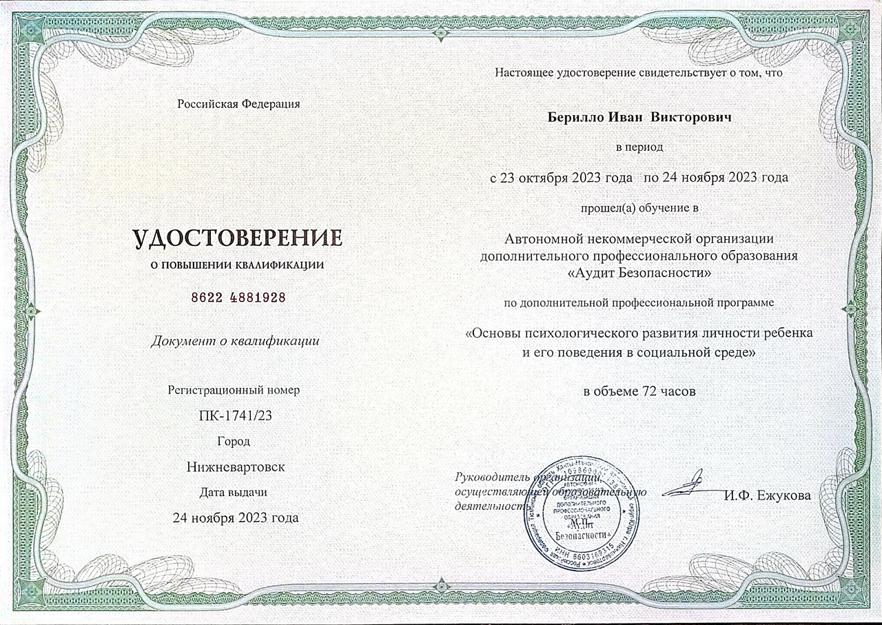 Обучение по курсу: "Основы психологического развития личности ребёнка и его поведения в социальной среде". Документ о повышении квалификации: скачать