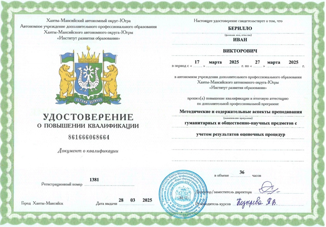 Обучение по курсу: «Методические и содержательные аспекты преподавания гуманитарных и общественно-научных предметов с учетом результатов оценочных процедур». Документ о повышении квалификации: скачать