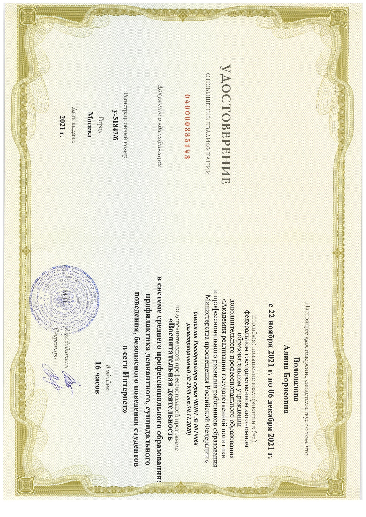 Обучение по курсу: Воспитательная деятельность в системе среднего профессионального образования: профилактика девиантного, суицидального поведения, безопасного поведения студентов в сети Интернет. Документ о повышении квалификации: скачать