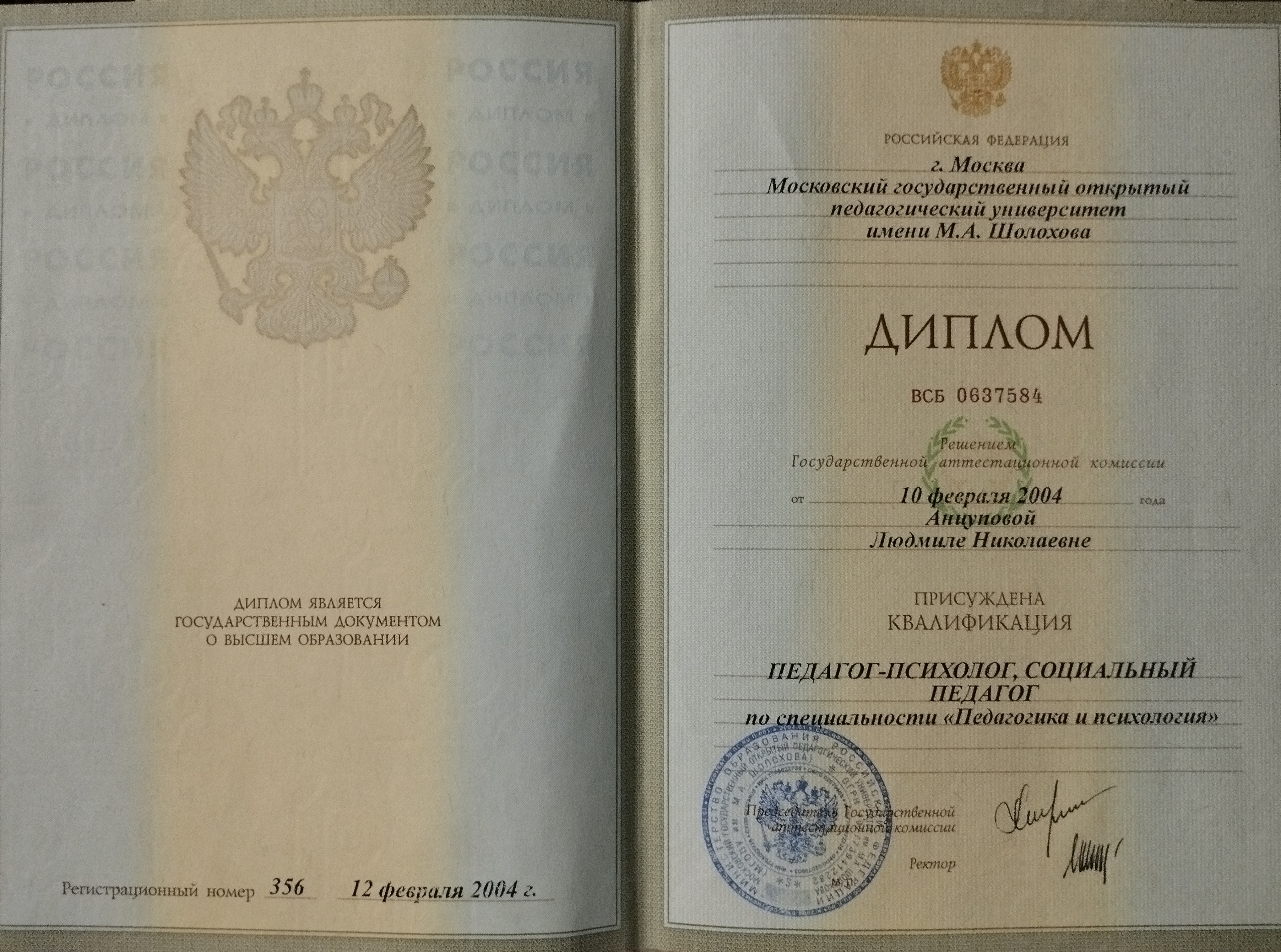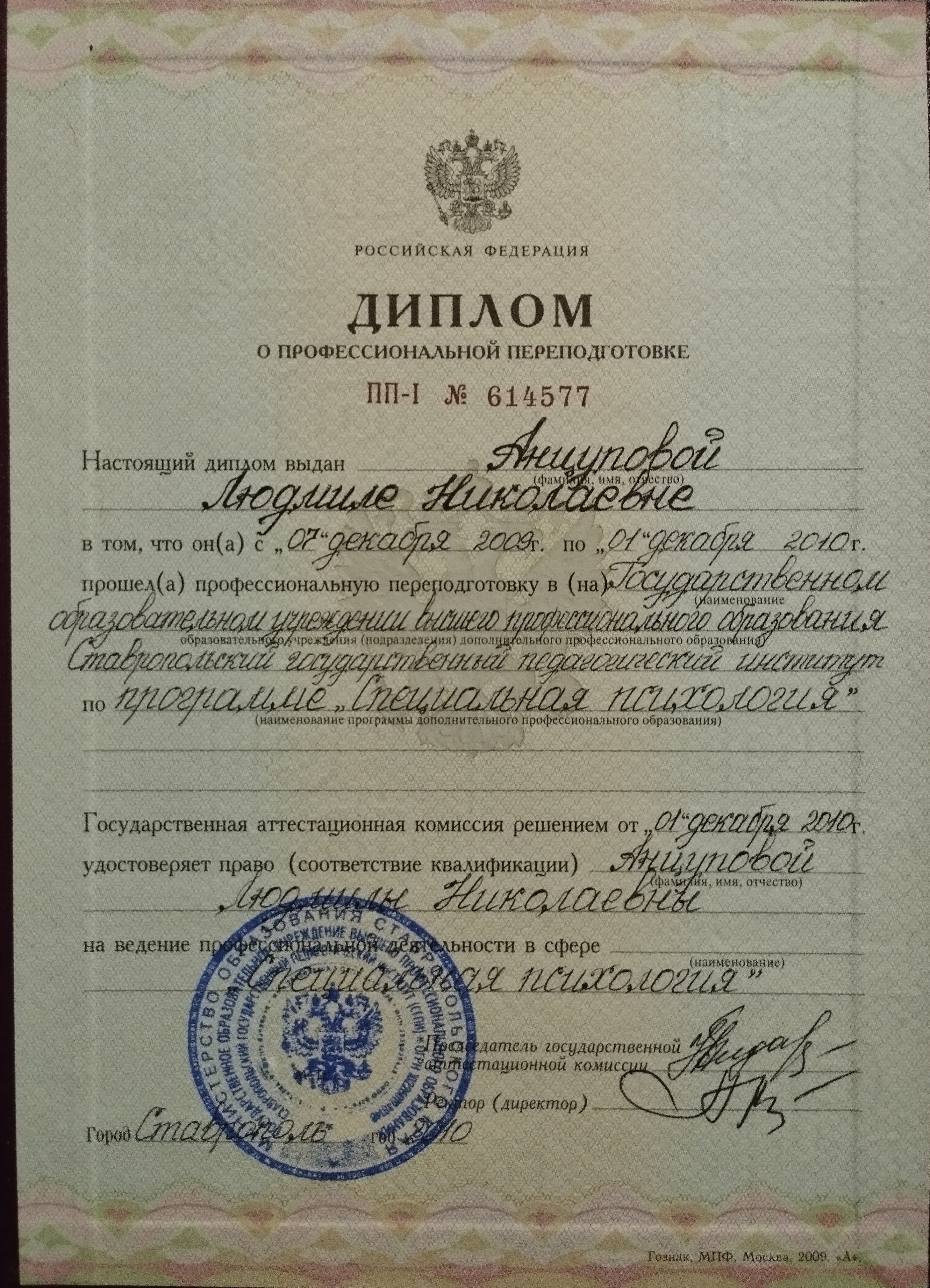 Образование по специальности: Специальная психология. Присвоена квалификация: Специальная психология. Документ о получении образования: скачать