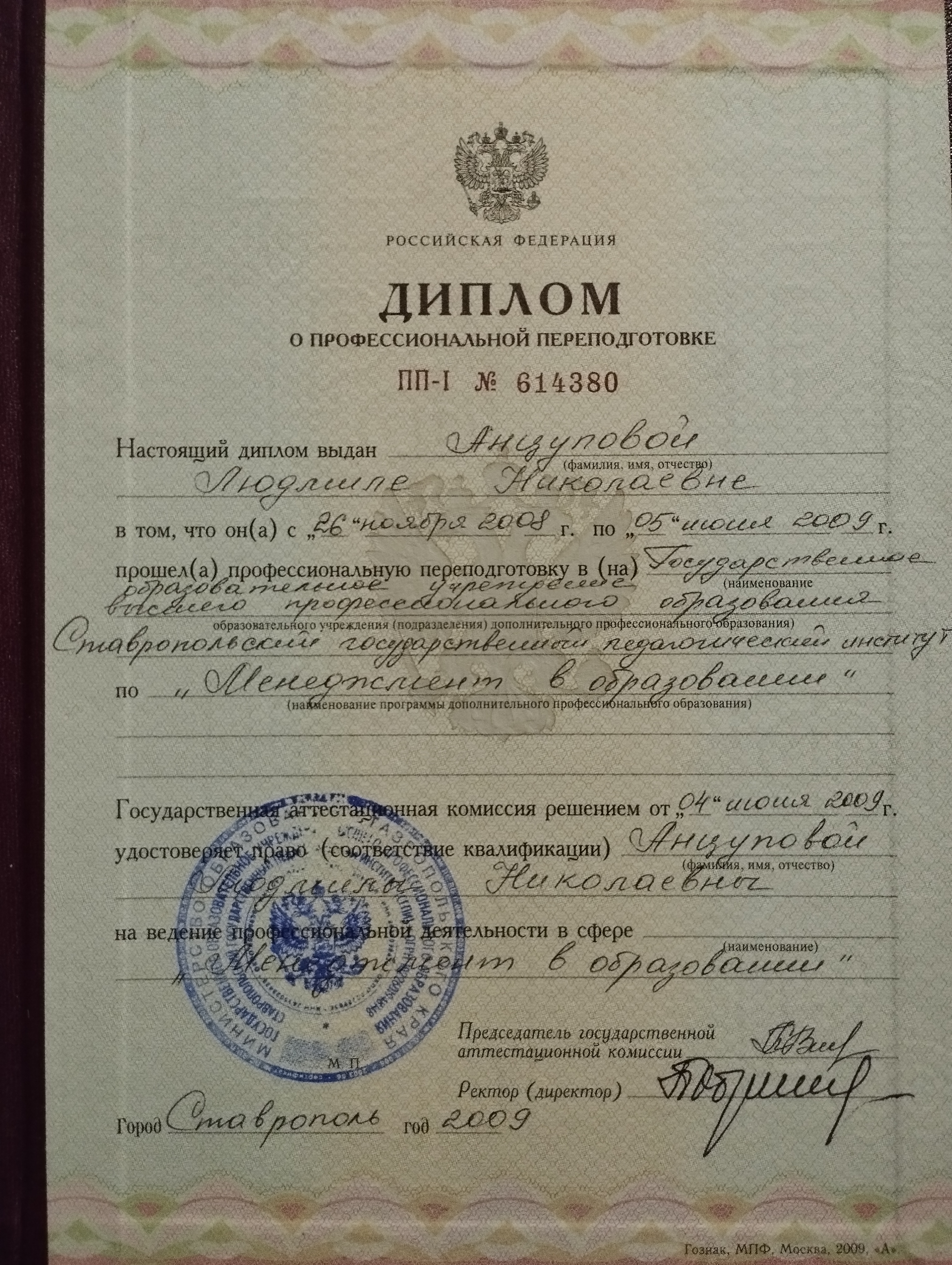 Образование по специальности: Менеджмент в образовании. Присвоена квалификация: Менеджмент в образовании. Документ о получении образования: скачать