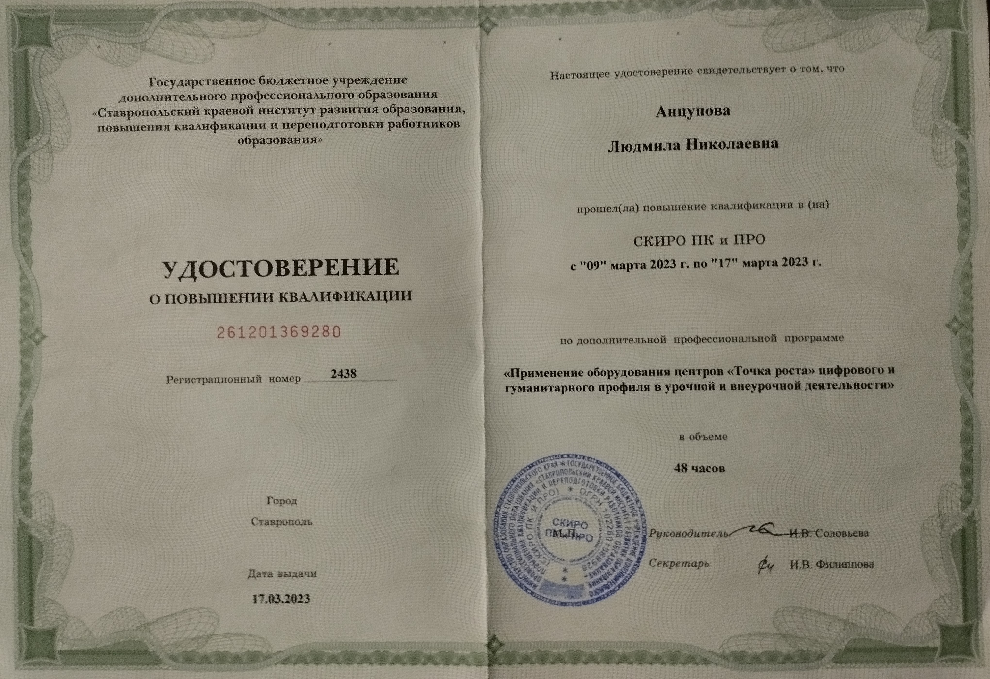 Обучение по курсу: Применение оборудования центров "Точка роста" цифрового и гуманитарного профиля в урочной и внеурочной деятельности. Документ о повышении квалификации: скачать