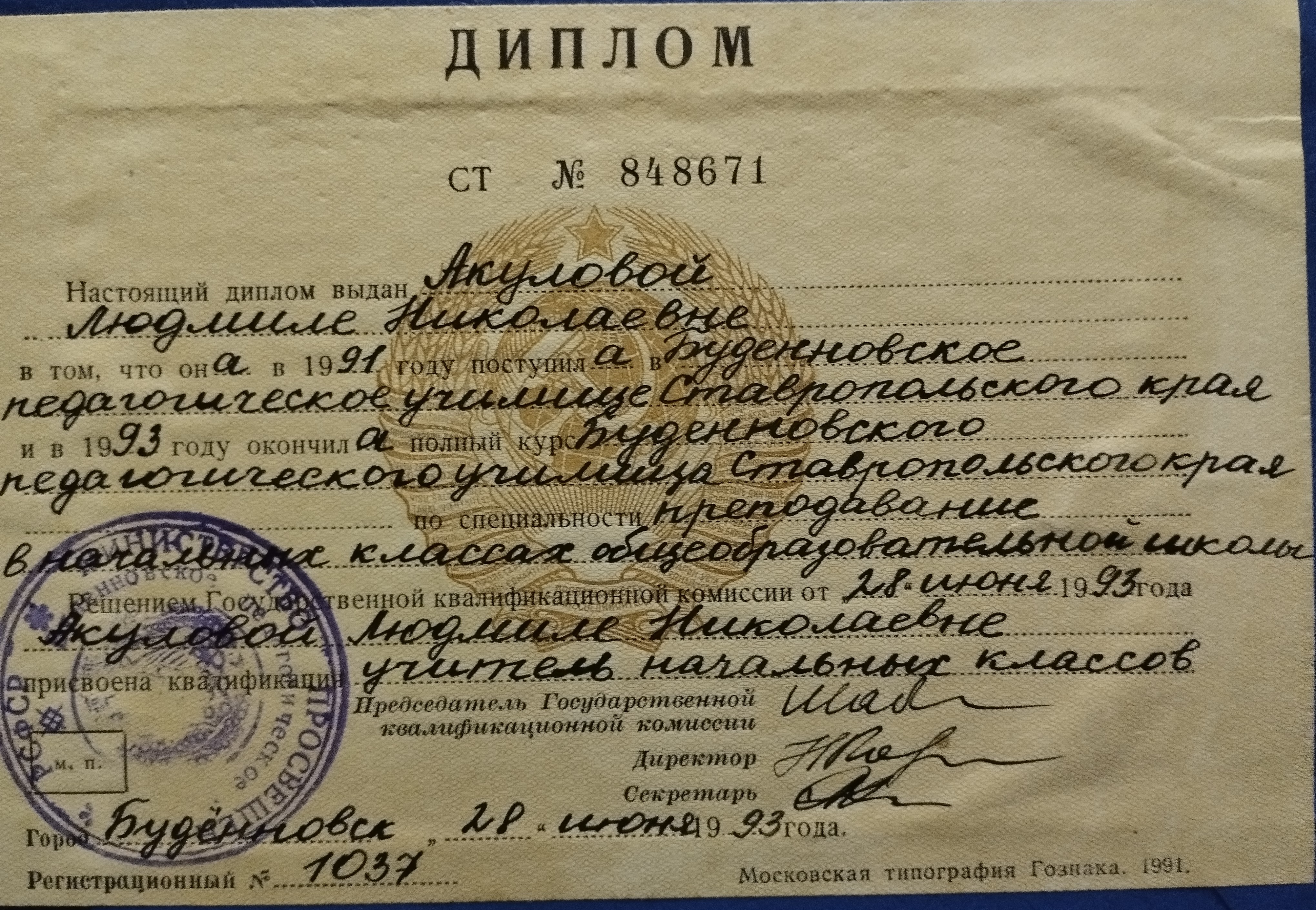 Образование по специальности: Преподавание в начальных классах общеобразовательной школы. Присвоена квалификация: учитель начальных классов. Документ о получении образования: скачать