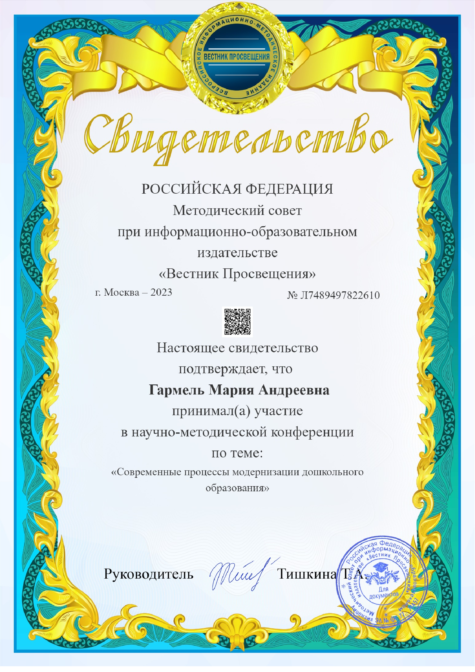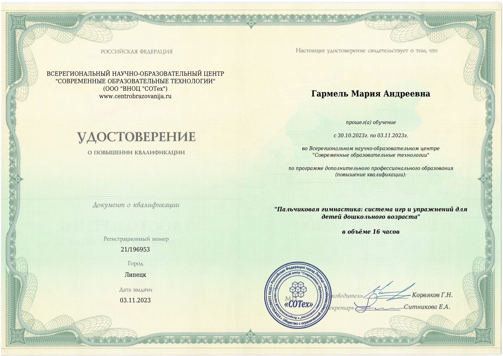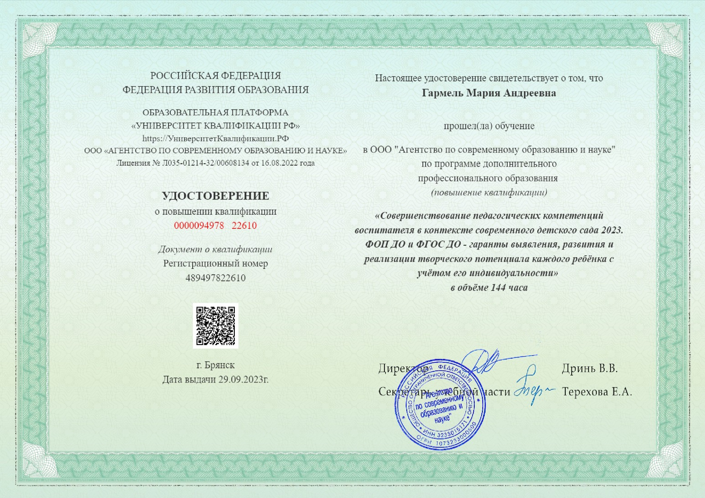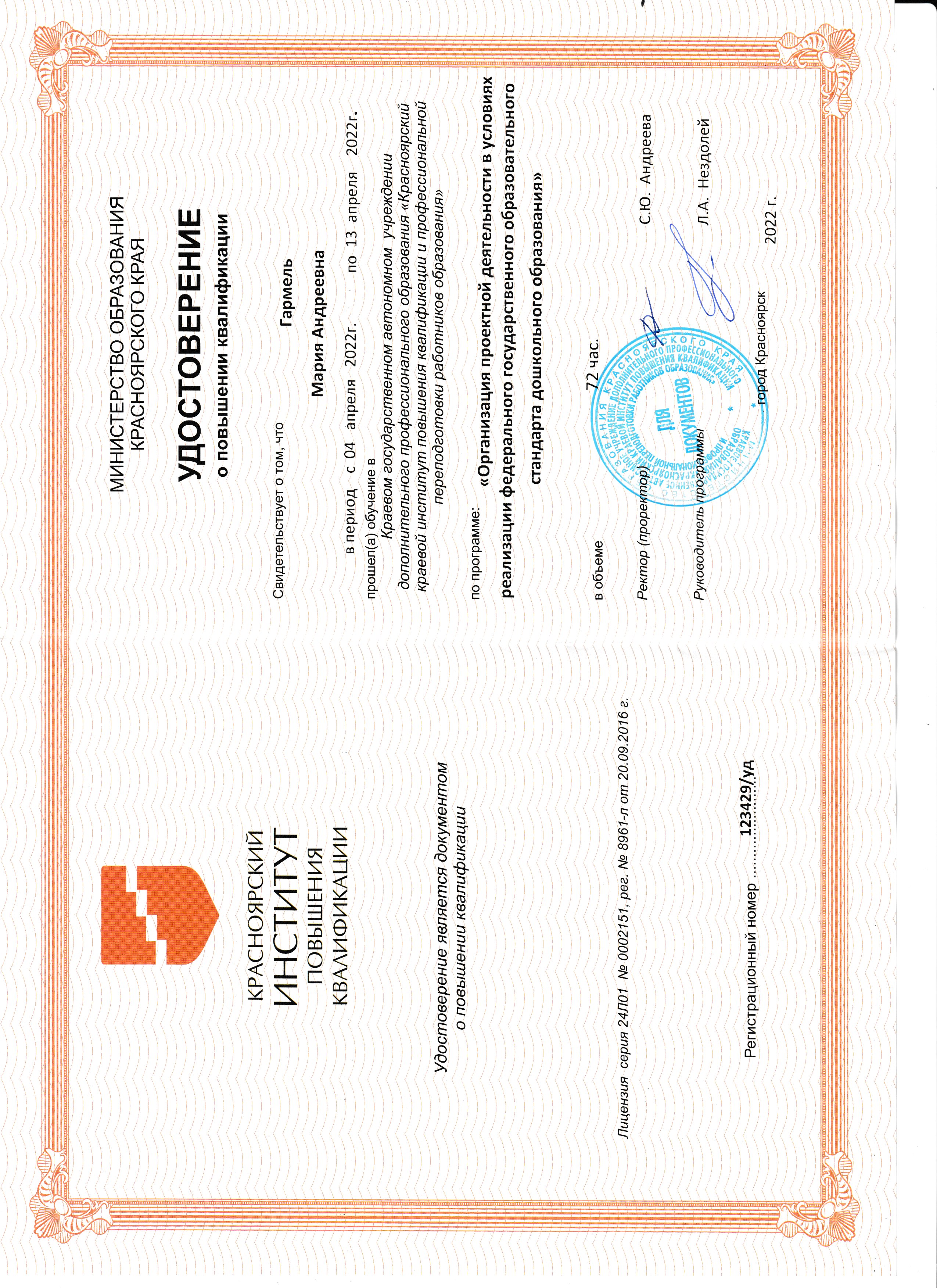 Обучение по курсу: совершенствование педагогических компетенций воспитателя в контексте современного детского сада 2023. ФОП ДО и ФГОС ДО- гаранты выявления, развития и реализации творческого потенциала каждого ребенка с учетом его индивидуальности в объеме 144 часа . Документ о повышении квалификации: скачать