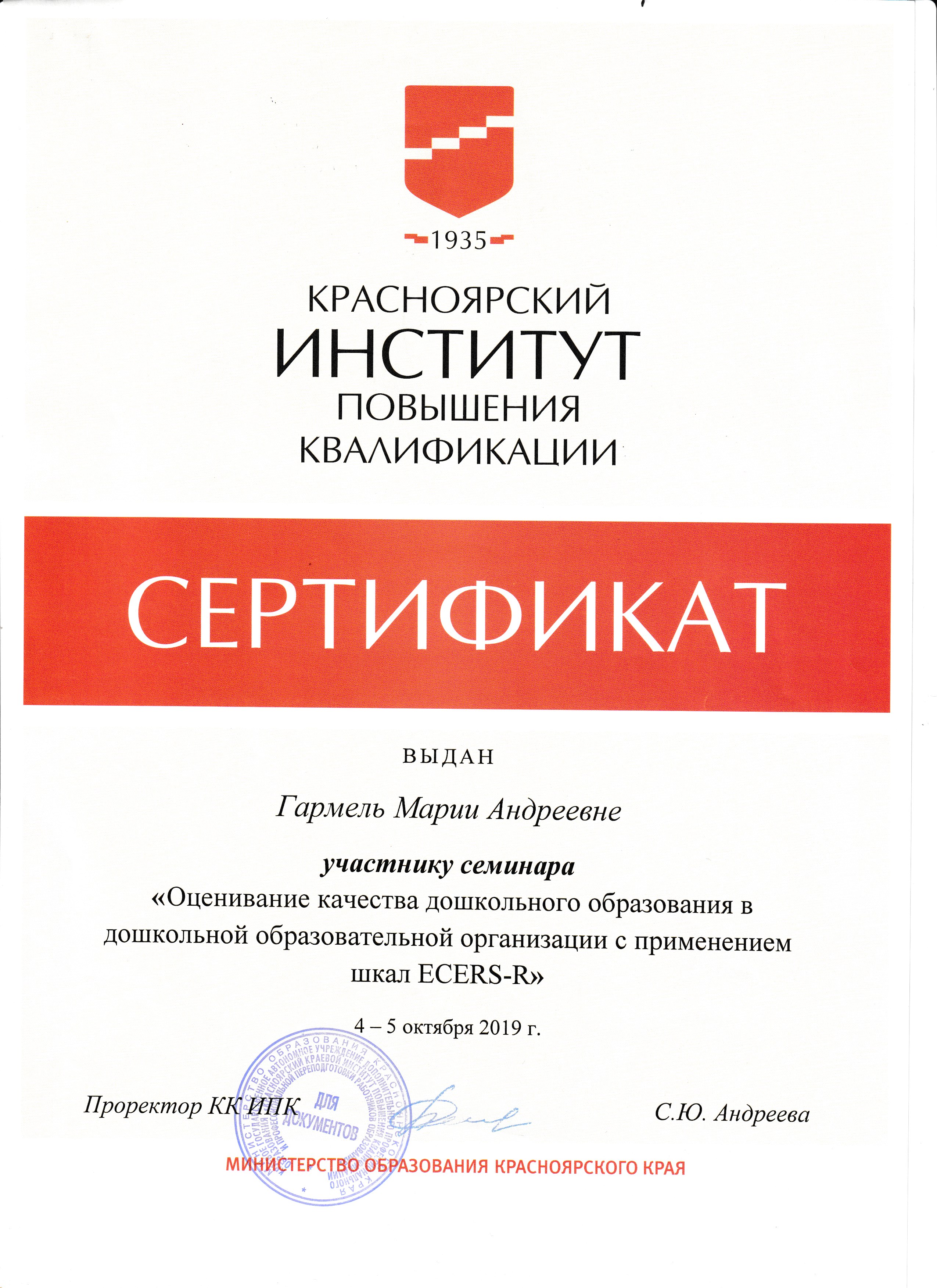 Обучение по курсу: Оценивание качества дошкольного образования в дошкольной образовательной организации с применением шкал ECERS-R. Документ о повышении квалификации: скачать