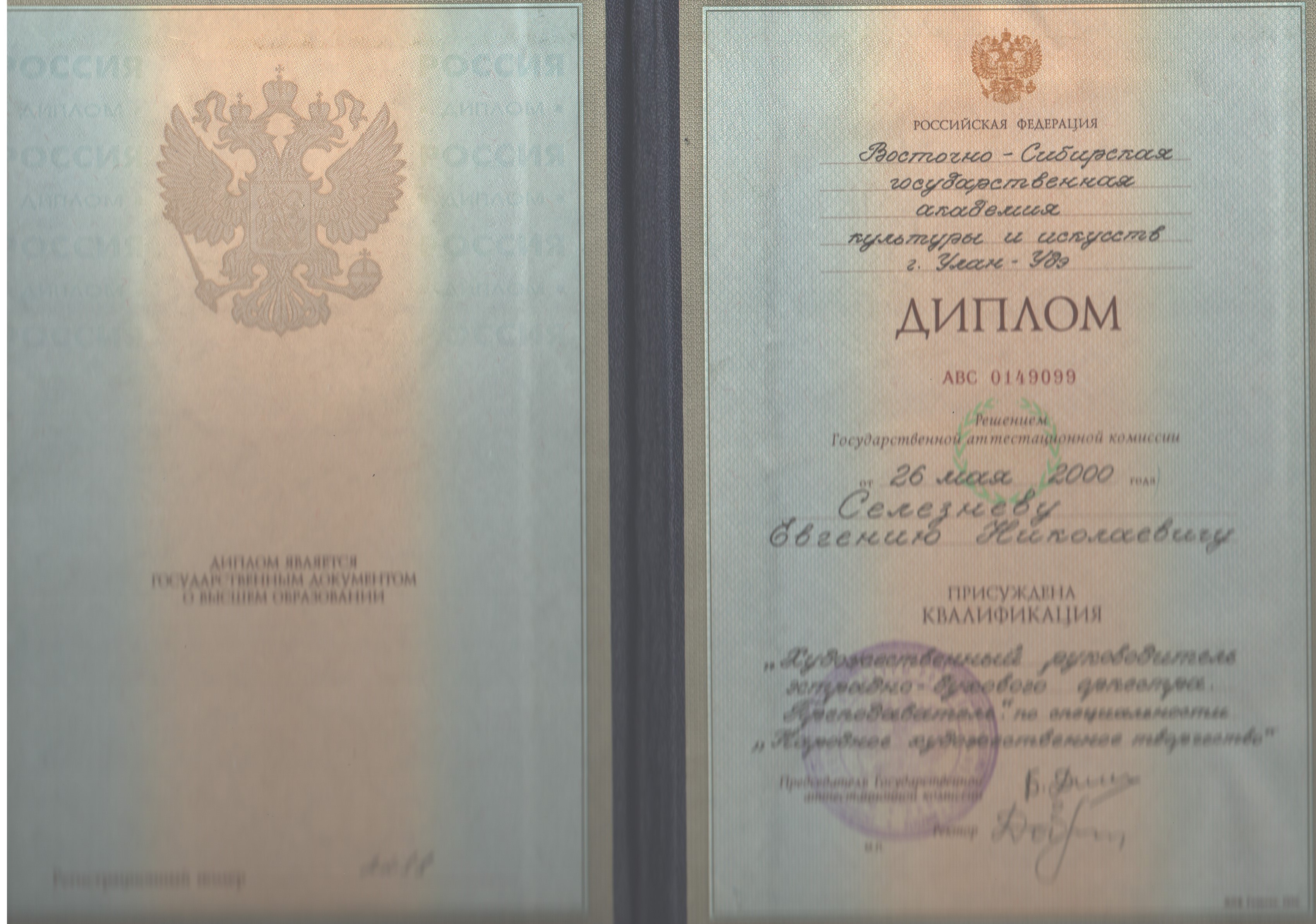 Образование по специальности: Народное художественное творчество. Присвоена квалификация: Художественный руководитель эстрадно-духового оркестра, преподаватель. . Документ о получении образования: скачать