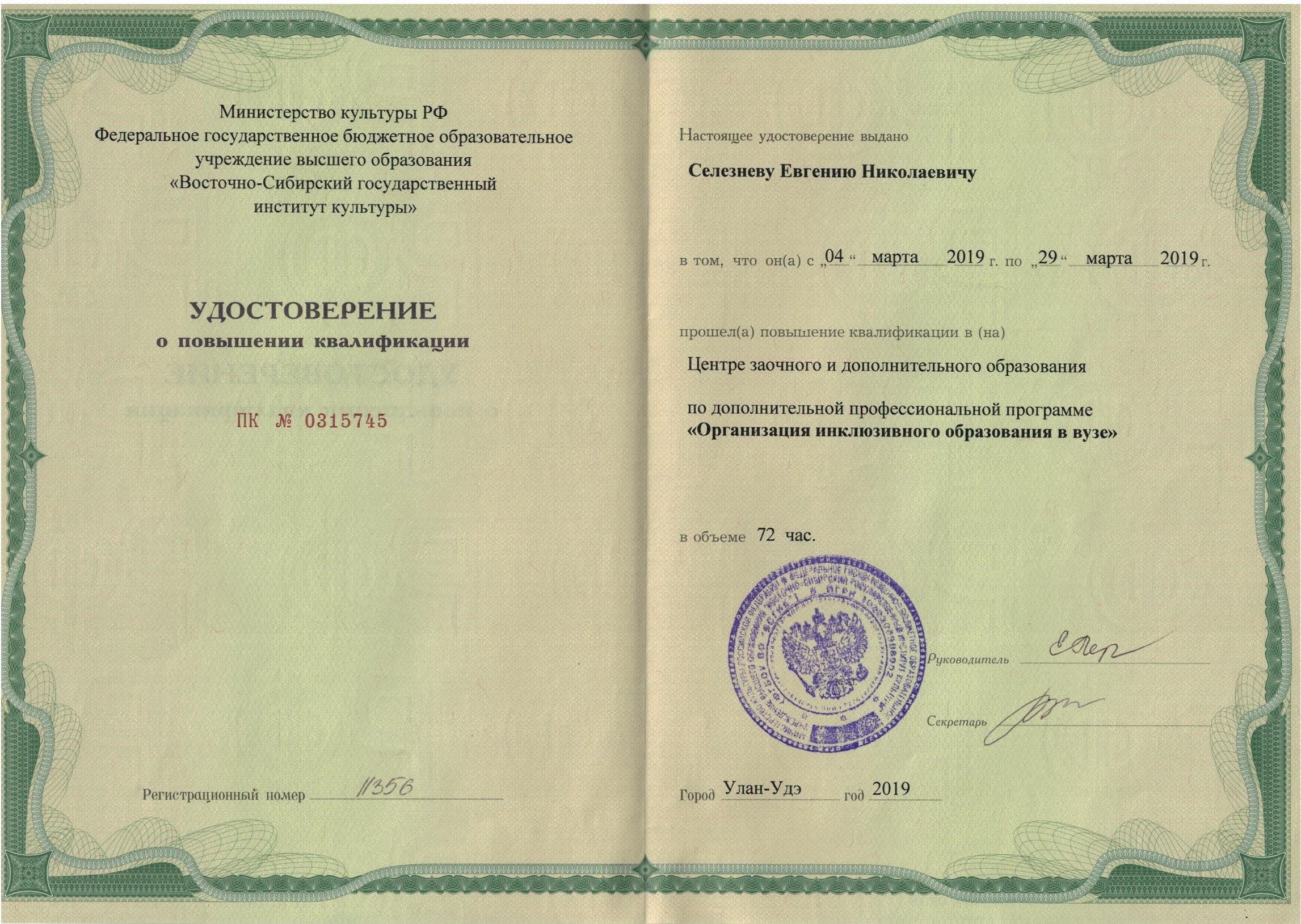 Обучение по курсу: Организация инклюзивного образования в вузе. Документ о повышении квалификации: скачать
