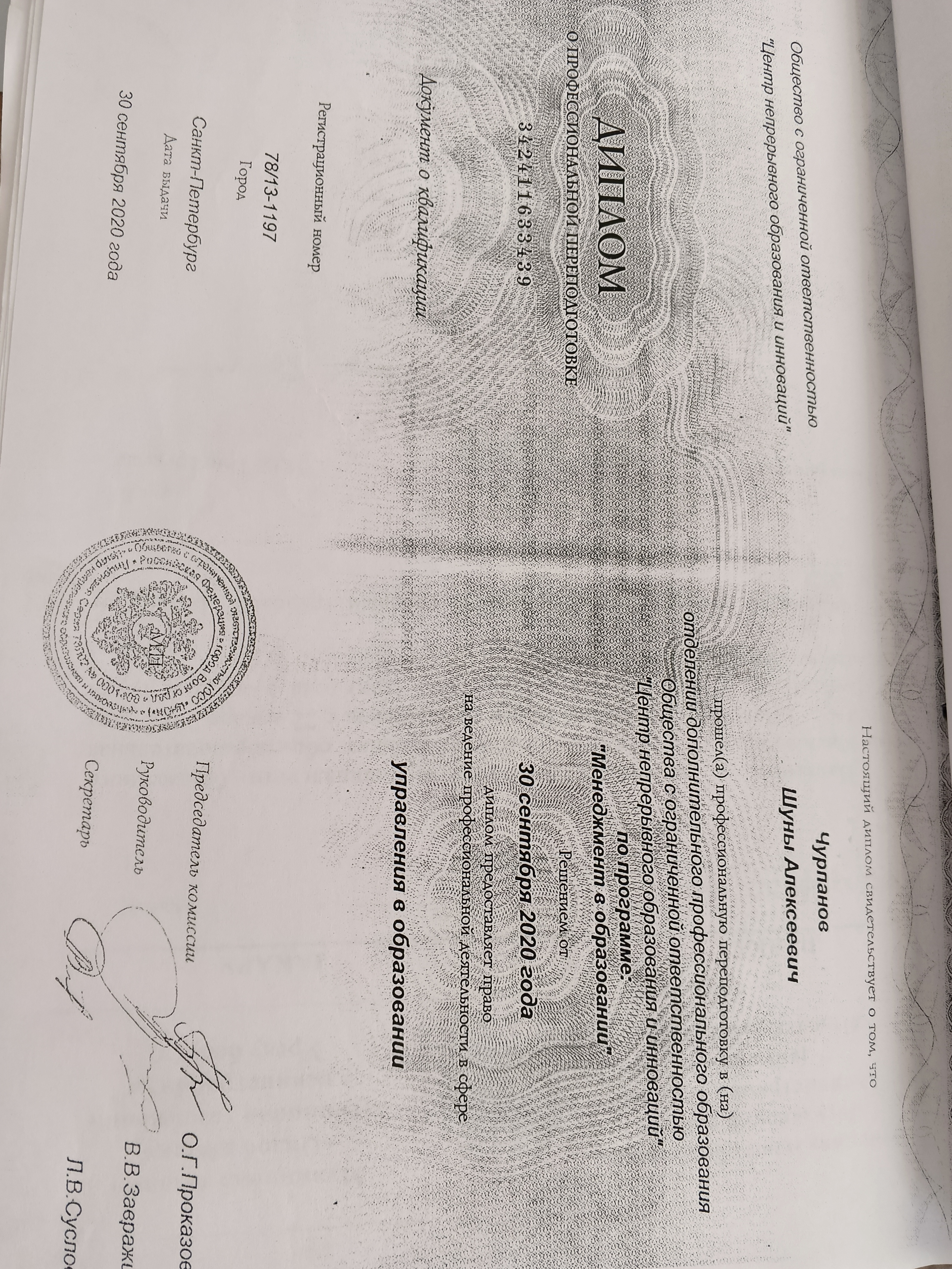Образование по специальности: "Менеджмент в образовании". Присвоена квалификация: Управление в образовании. Документ о получении образования: скачать