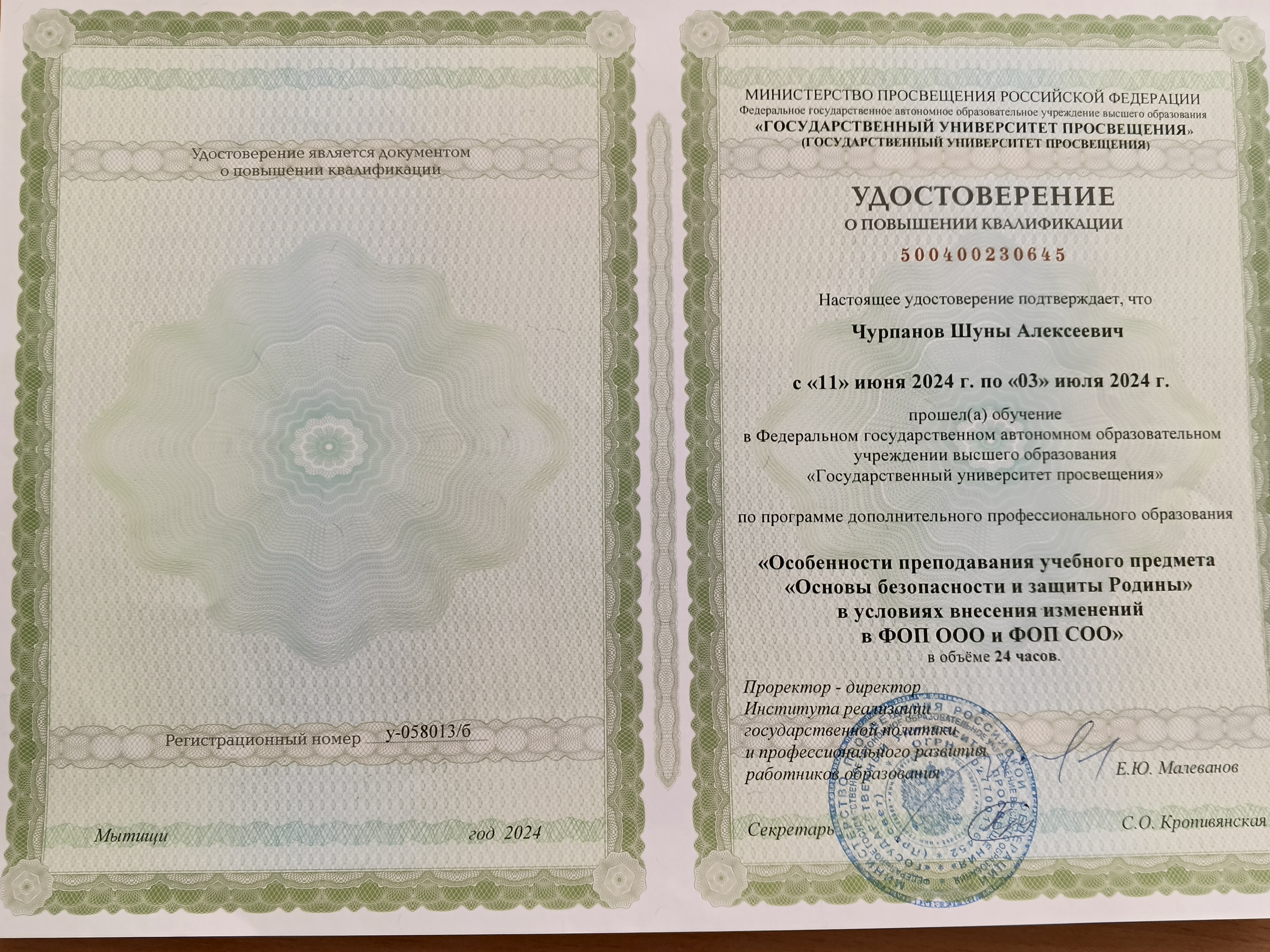 Обучение по курсу: "Особенности преподавания учебного предмета "Основы безопасности и защиты Родины"в условиях внесения изменений в ФОП ООО и ФОП СОО". Документ о повышении квалификации: скачать