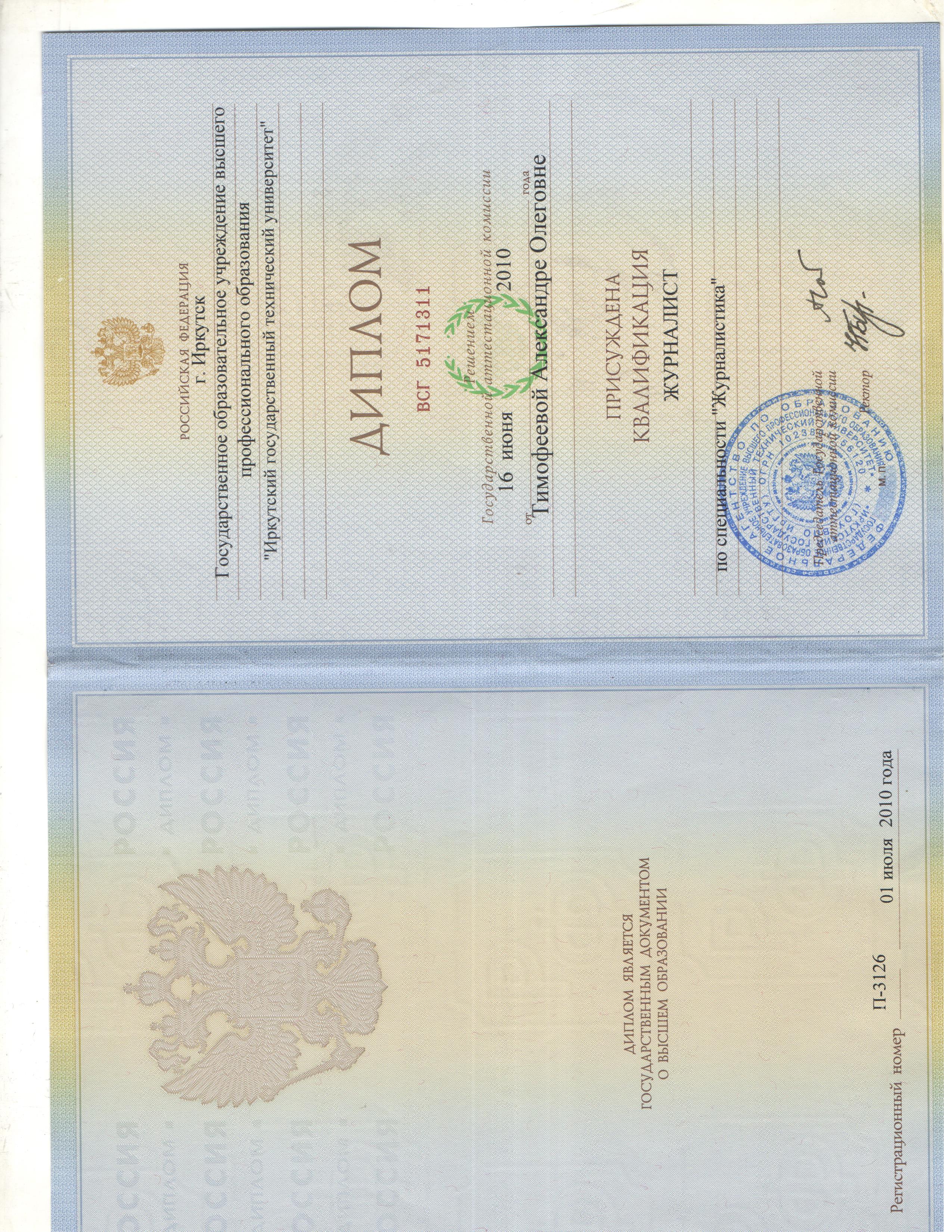 Образование по специальности: журналистика. Присвоена квалификация: журналист . Документ о получении образования: скачать