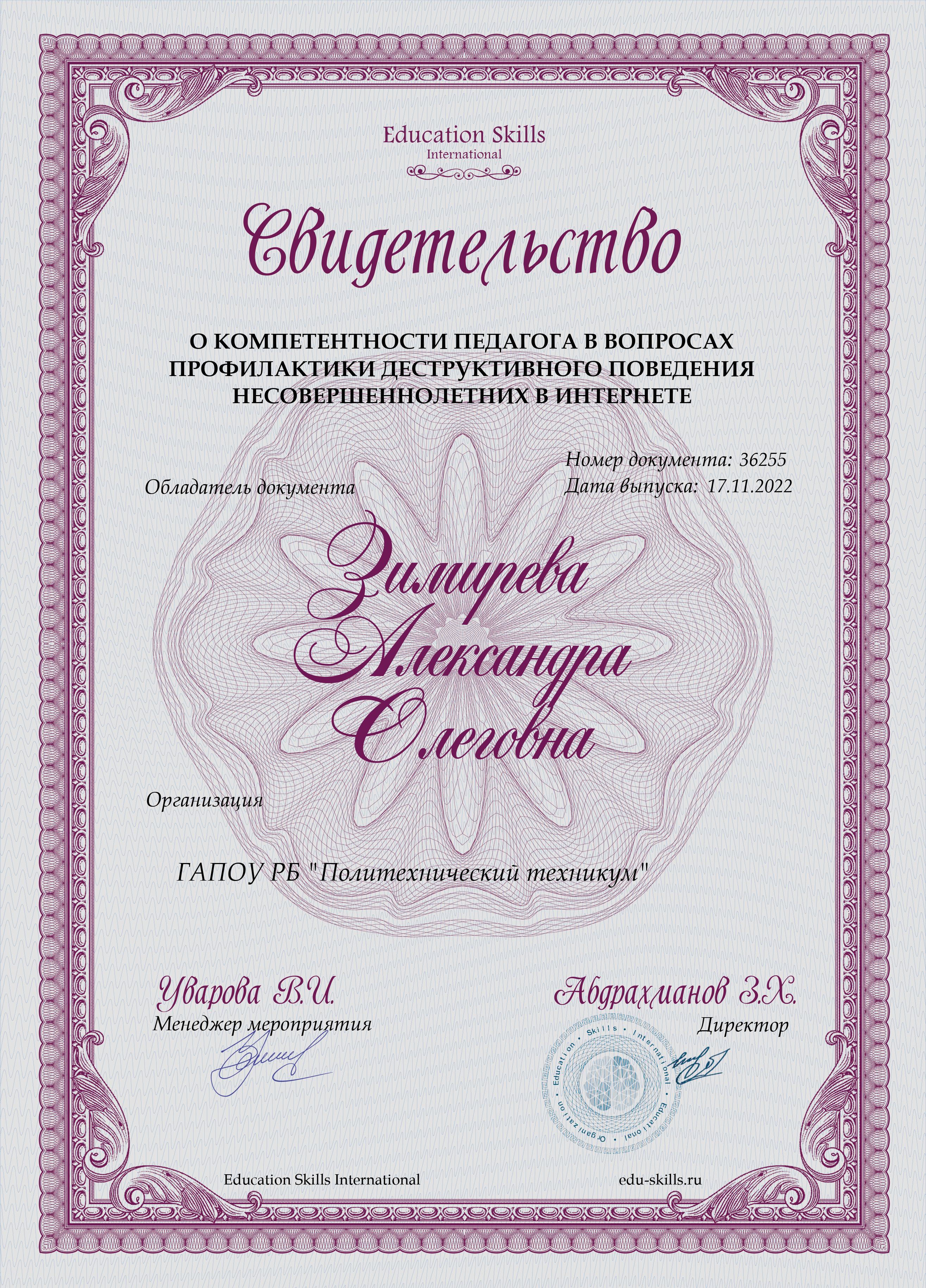 Обучение по курсу: О компетентности педагога в вопросах профилактики деструктивного поведения несовершеннолетних в интернете . Документ о повышении квалификации: скачать