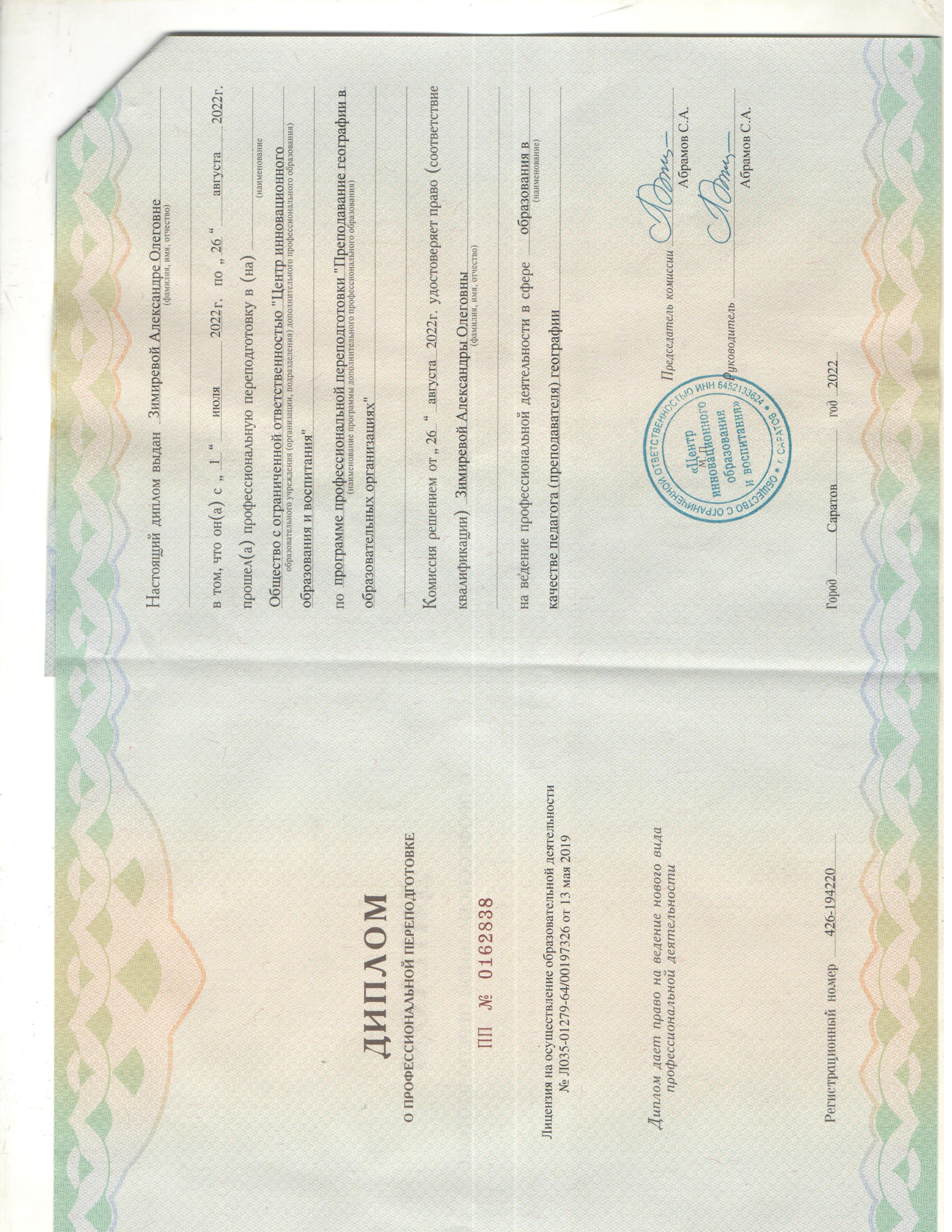 Образование по специальности: Преподавание географии в образовательных организациях». Присвоена квалификация: педагог (преподаватель) географии. Документ о получении образования: скачать