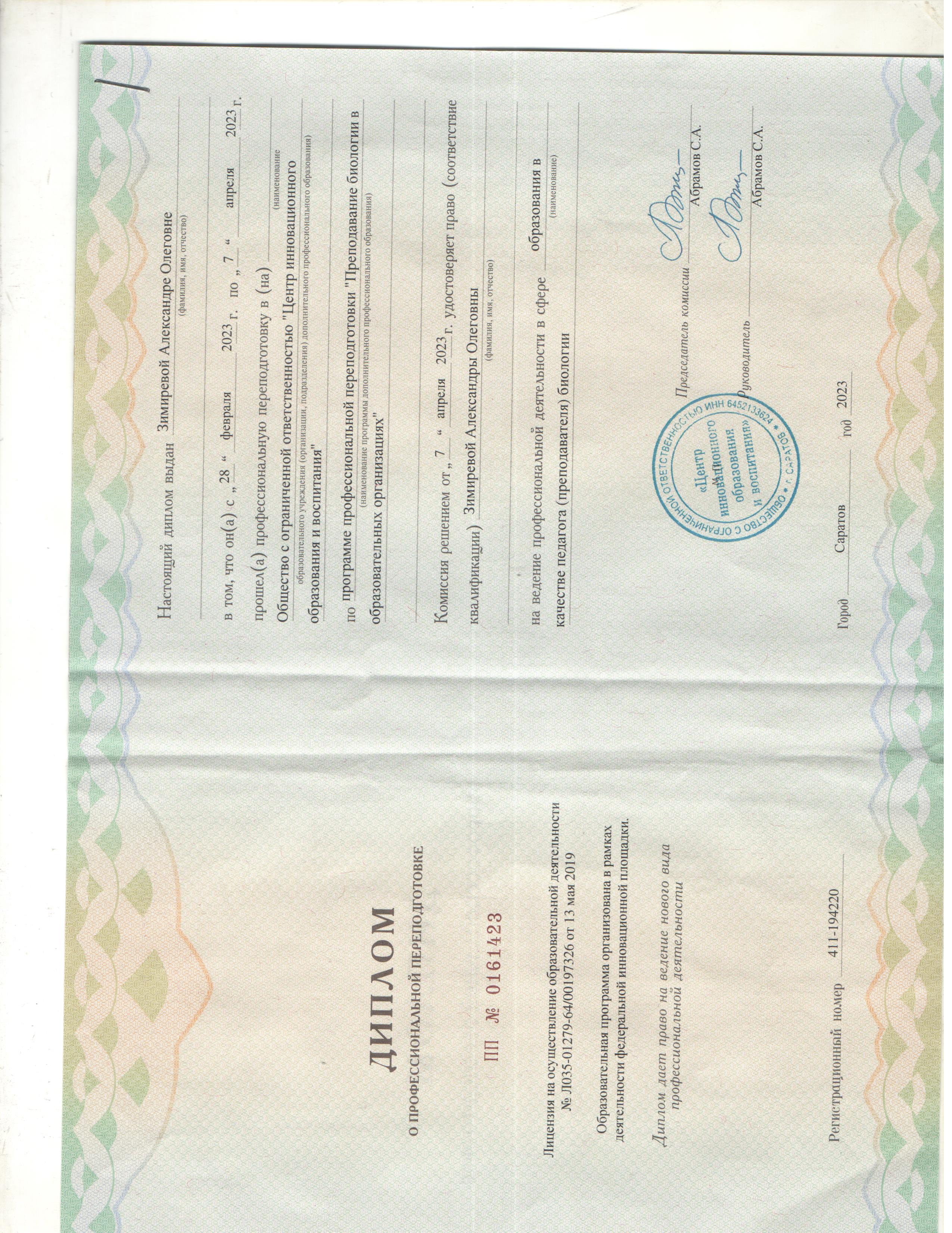 Образование по специальности: ведение профессиональной деятельности в сфере образования в качестве педагога (преподавателя) биологии). Присвоена квалификация: педагог (преподаватель) биологии. Документ о получении образования: скачать