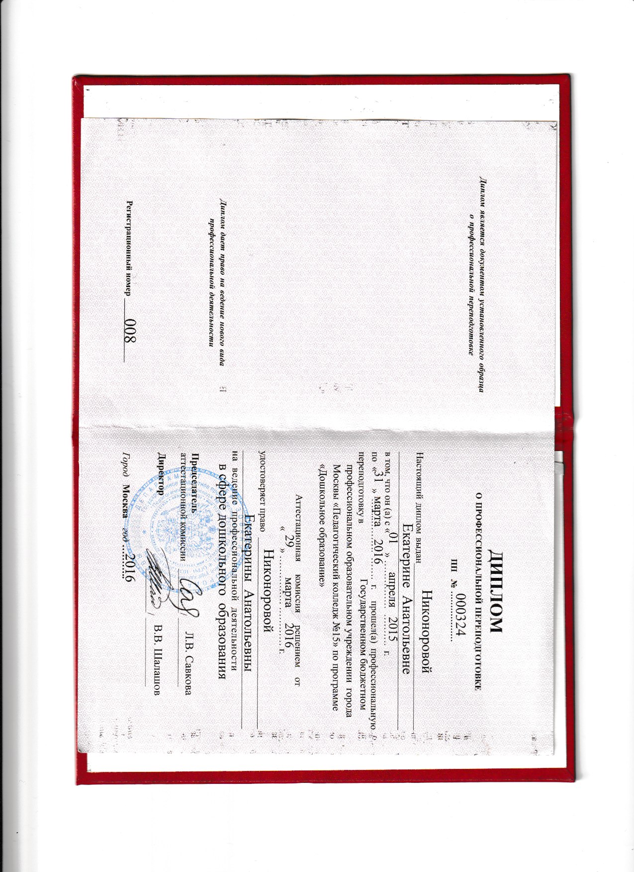 Образование по специальности: Дошкольное воспитание. Присвоена квалификация: Воспитатель. Документ о получении образования: скачать
