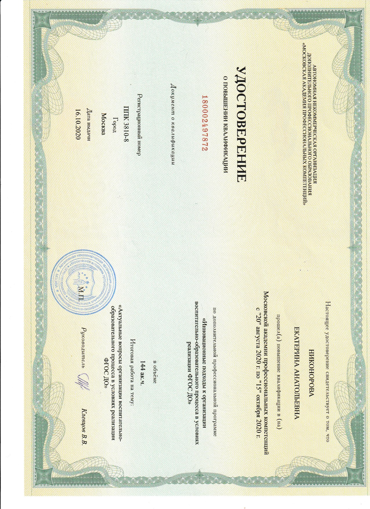 Обучение по курсу: "Инновационные подходы к организации воспитательно-образовательного процесса в условиях реализации ФГОС ДО". Документ о повышении квалификации: скачать
