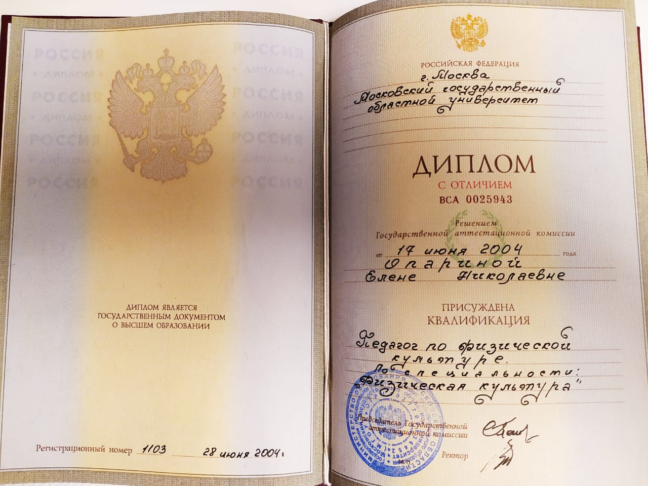 Образование по специальности: Физическая культура. . Присвоена квалификация: педагог по физической культуре.. Документ о получении образования: скачать