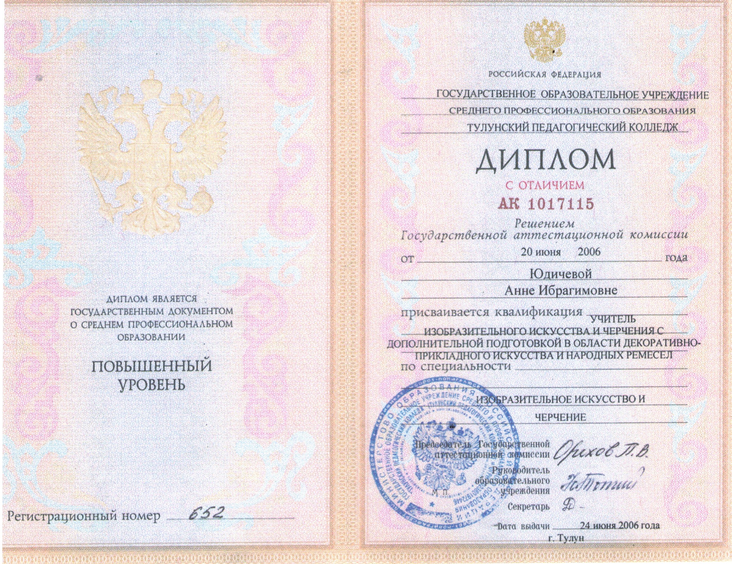 Образование по специальности: учитель изобразительного искусства и черчения с дополнительной подготовкой в области декоративно-прикладного искусства и народных ремесел. Присвоена квалификация: Изобразительное искусство и черчение. Документ о получении образования: скачать